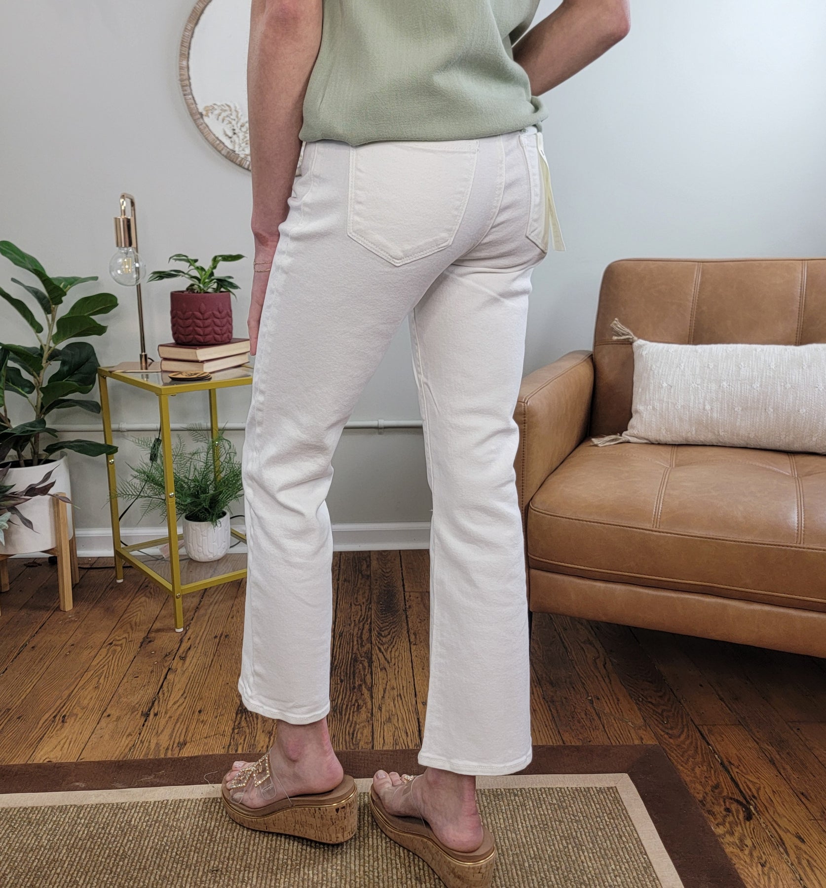 Mid rise, tummy control white jeans from Risen in a fun cropped bootcut fit. Denim has nice stretch for a comfortable fit all day long.
