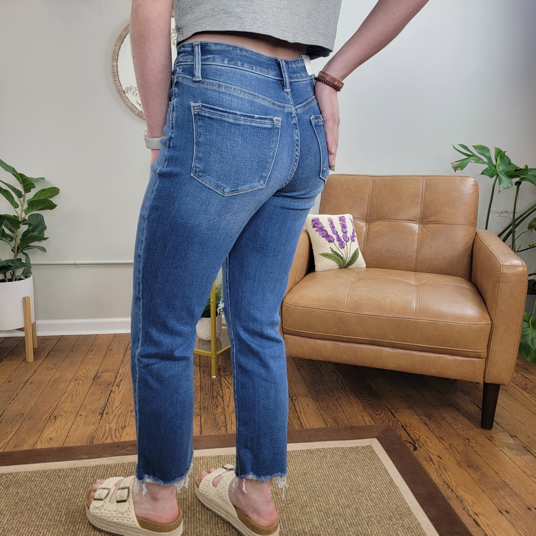 Medium wash, high rise, cropped straight jeans from Lovervet by Vervet. Jeans have a distressed right knee and frayed hems. Single button, zip closure and 5-pocket design.