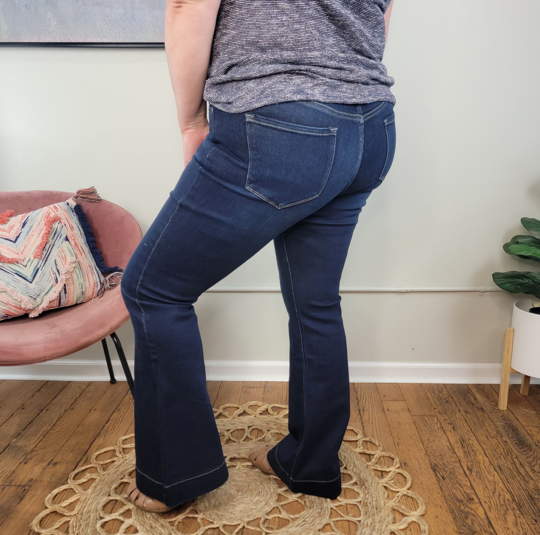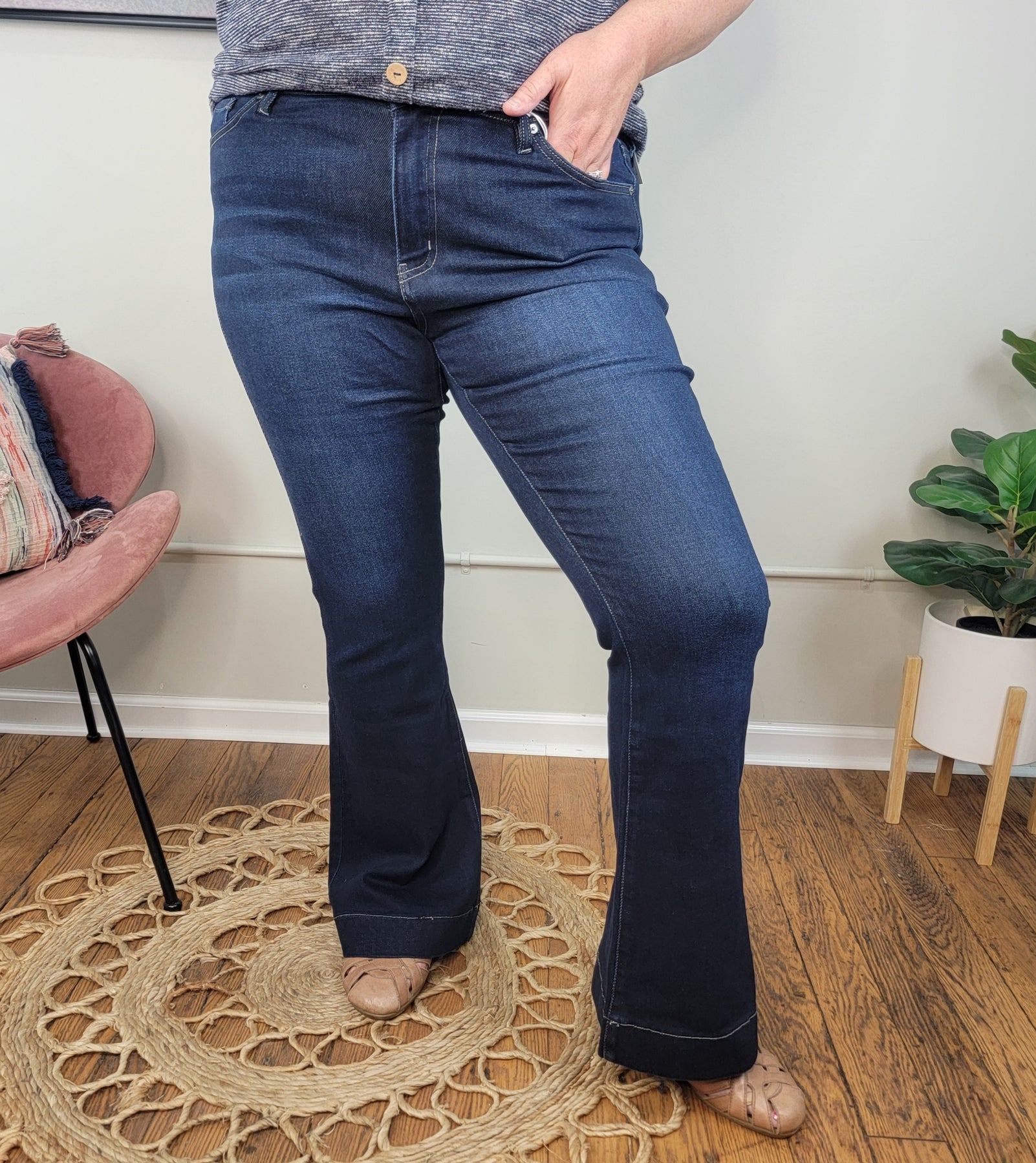 Dark Wash, non-distressed flares by KanCan. High rise with finished hems for a classy look. These have great stretch and fit true to size.