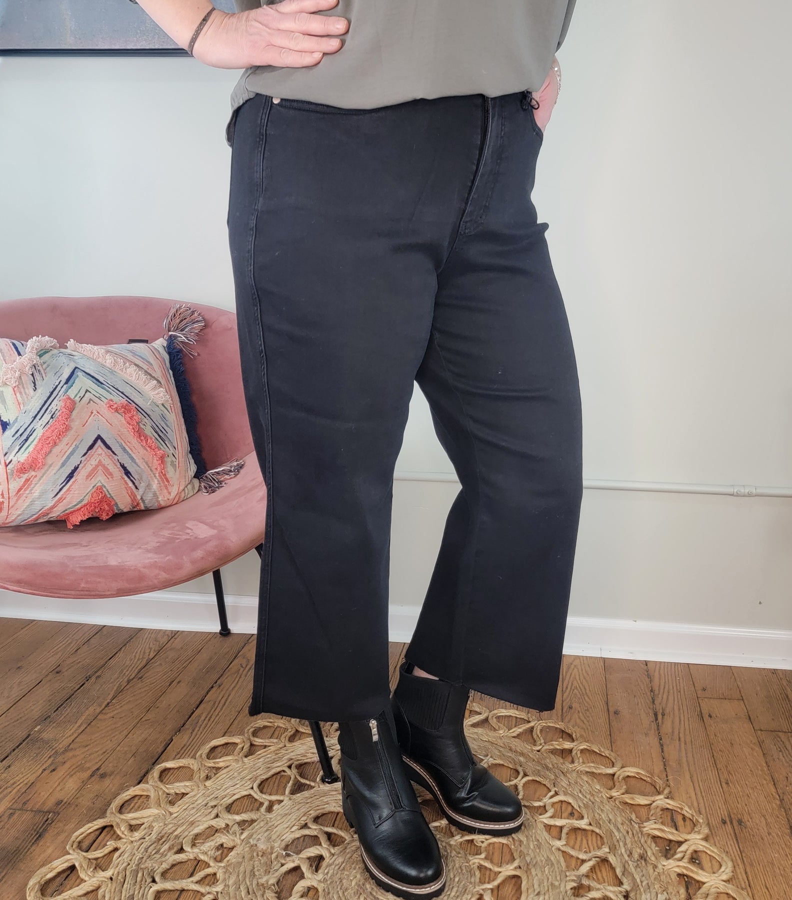 A person wearing Judy Blue's Rylee Tummy Control Cropped Wide Legs stands barefoot on a wooden floor beside a pink chair with a colorful pillow and a small green plant.