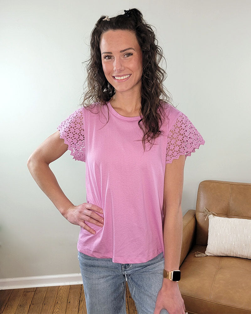 Scalloped lace sleeves add just the right amount of pretty to this crew neck top. Perfect for work, or casual days.