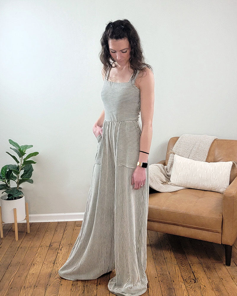 This wide leg dark olive romper showcases multi-directional stripes. The romper features a square neck pockets, and a fun twist in the back! It is lightweight and perfect for spring and summer!