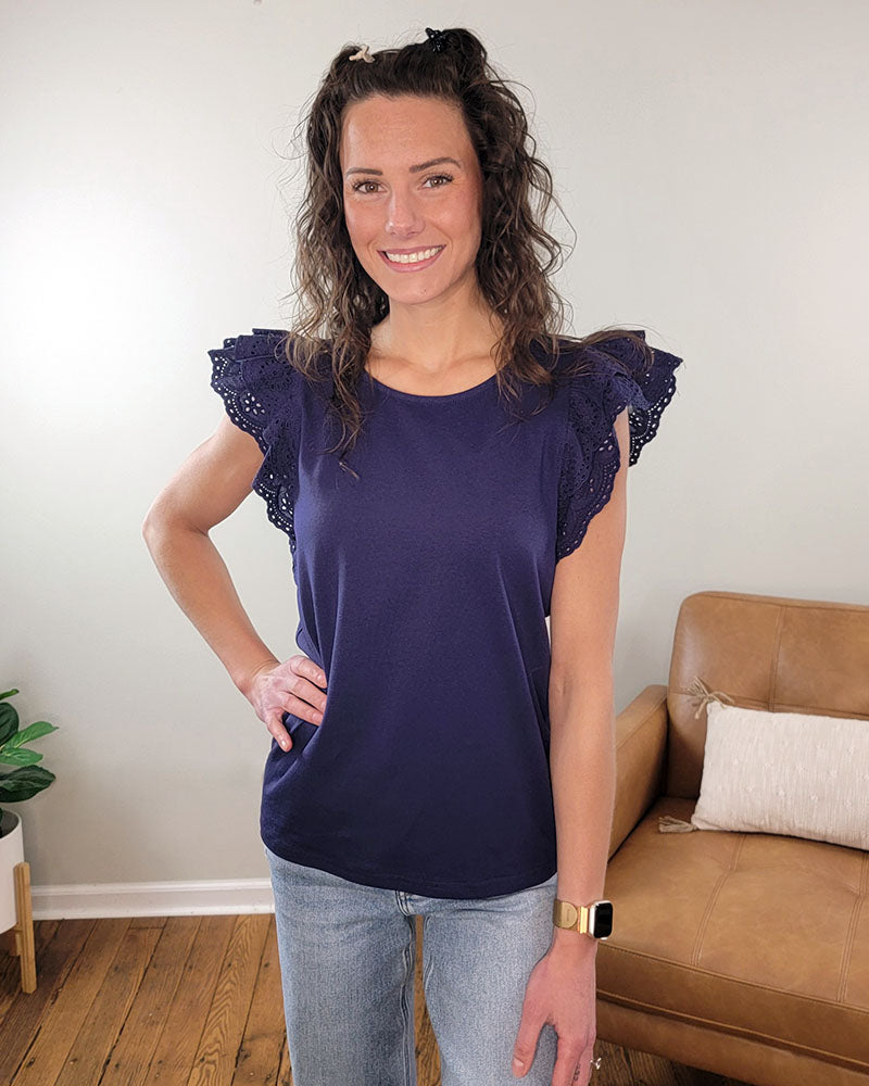 Pretty eyelet lace makes up the flutter sleeves on this navy top. Crew neck and straight hem completes the fit. We love this one for work and for play as you can easily dress it up or keep it casual with your favorite jeans.