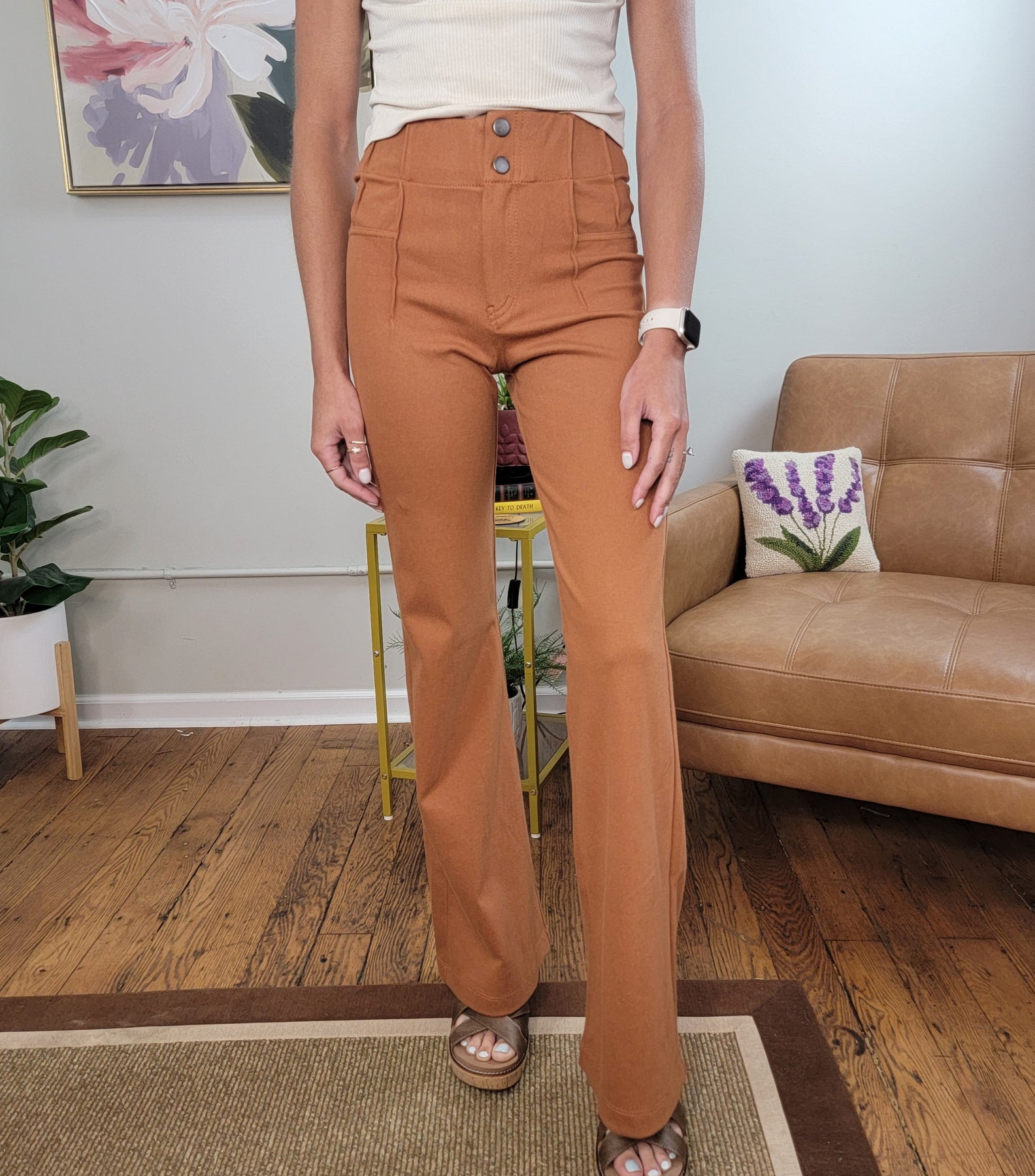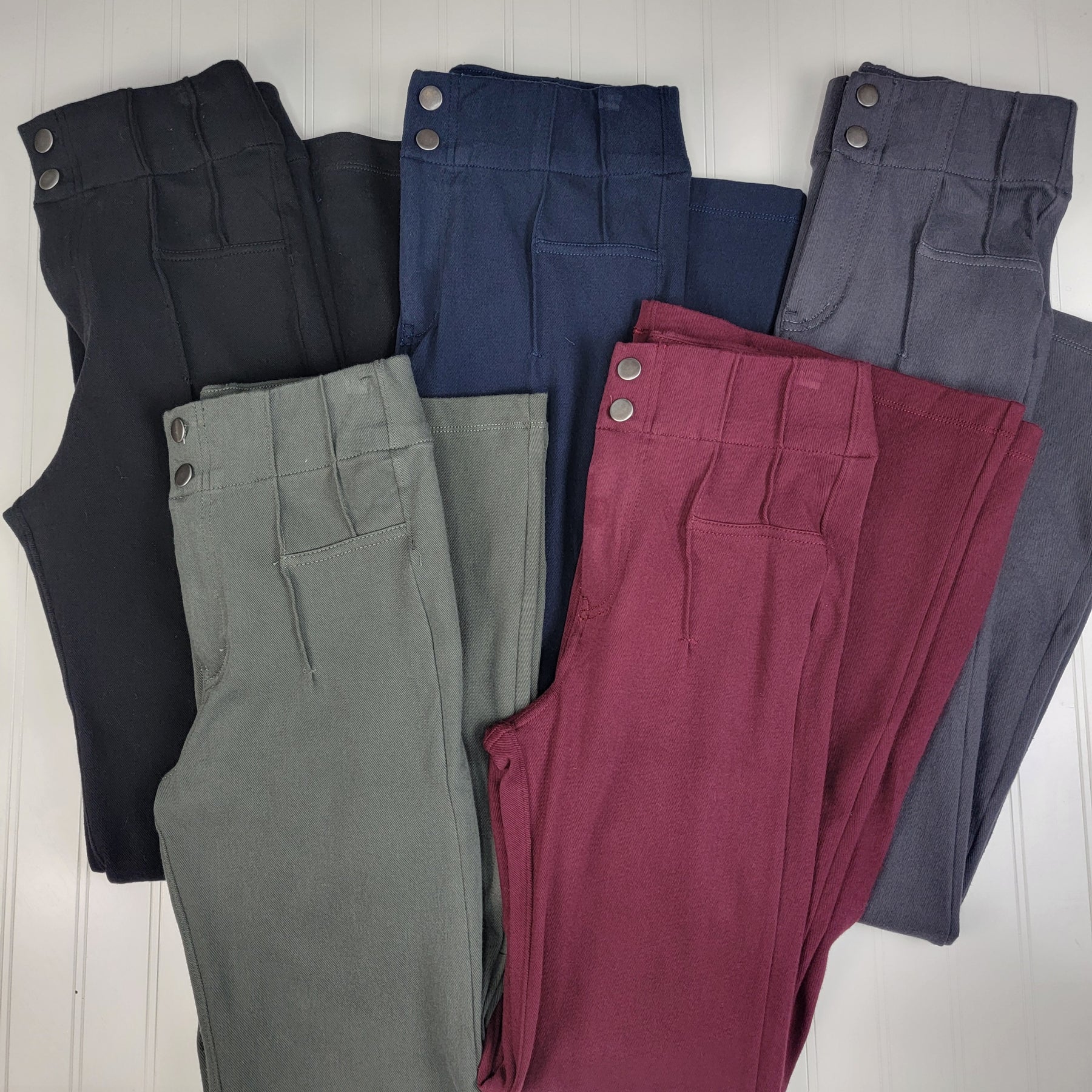 These black stretch dress pants are a cross between leggings and dress pants, but with a figure flattering flare leg. Pintuck details at the waist create a sliming silhouette while the double button closure gives the leggings a finished look. Perfect for when you need a more professional look, but don't want to sacrifice comfort.