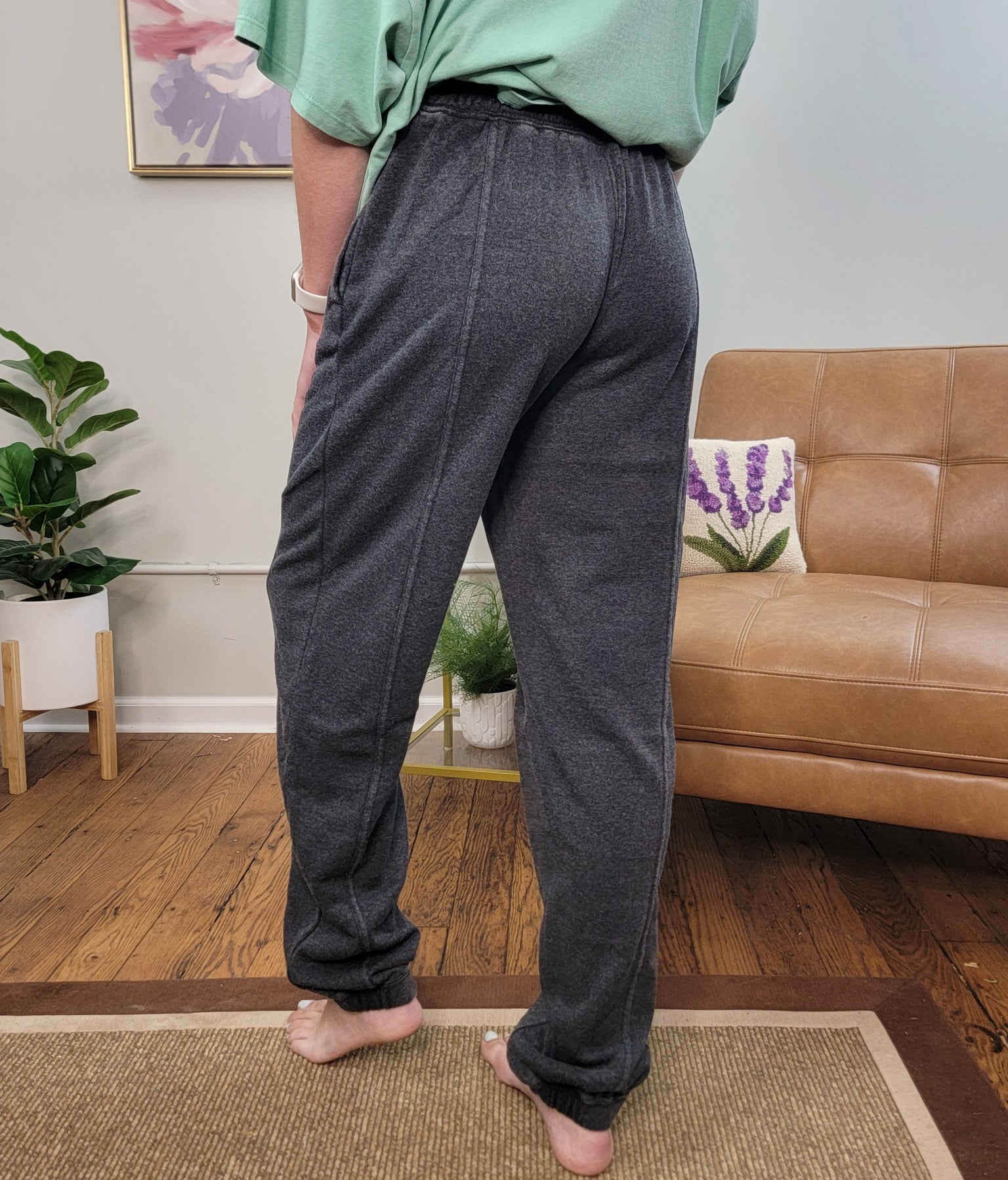 These ultra comfy sweatpants have a fun seam detail on the front of the legs. Elastic, drawstring waist and side pockets finish the fit. Sweats are high-rise, so you can roll the waist if you prefer to have them sit lower on the hips.