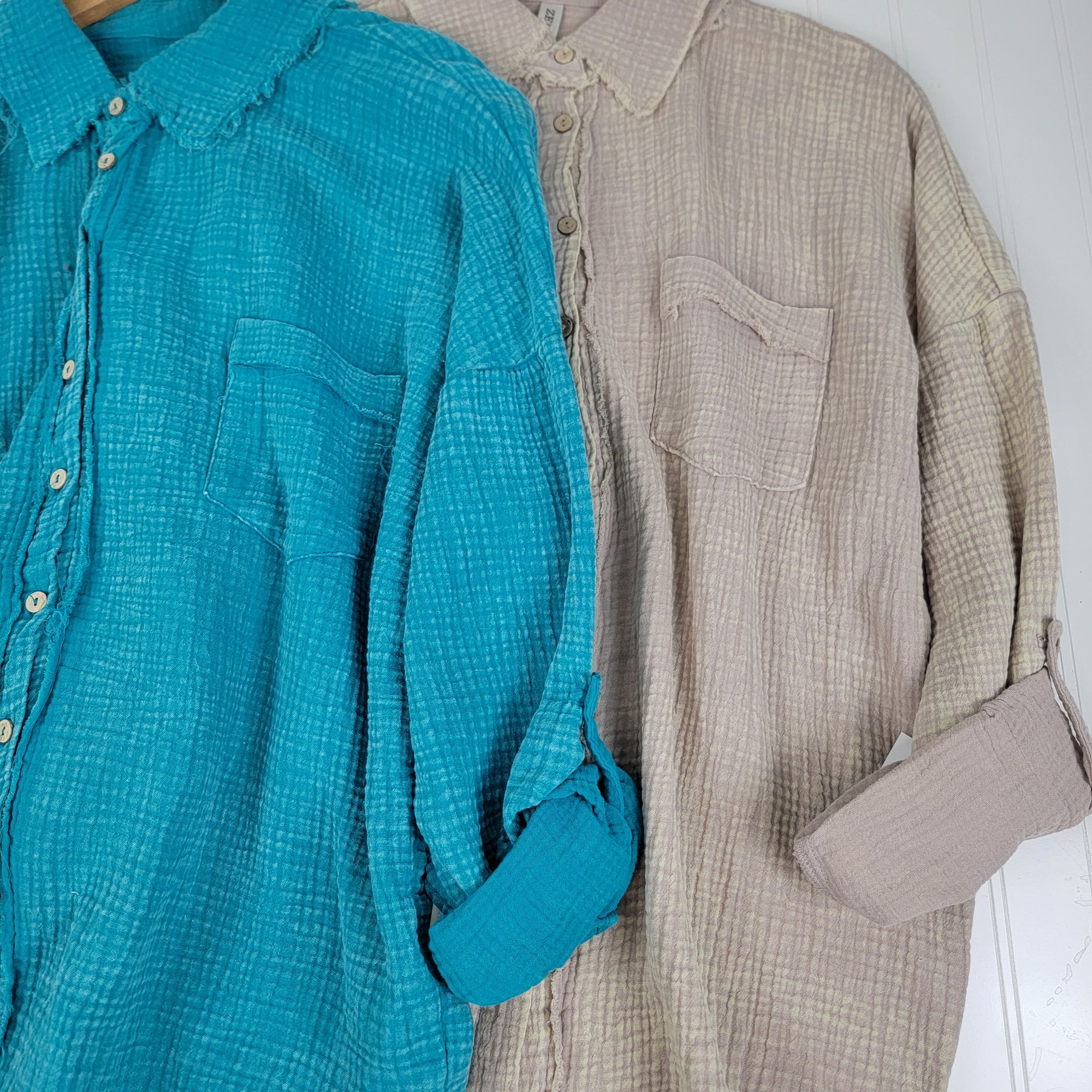 Perfect in lieu of a cardigan this season, this washed, double gauze button down is a lighter wight with great movement that effortlessly pairs with tank tops and graphic tees. Casual and comfy with button up sleeves and chest pocket. Due to the wash process, variations in color will occur. Shirt has a boxier fit, with plenty of room through the torso. However, the material doesn't have much stretch. Single chest pocket and frayed seam details.