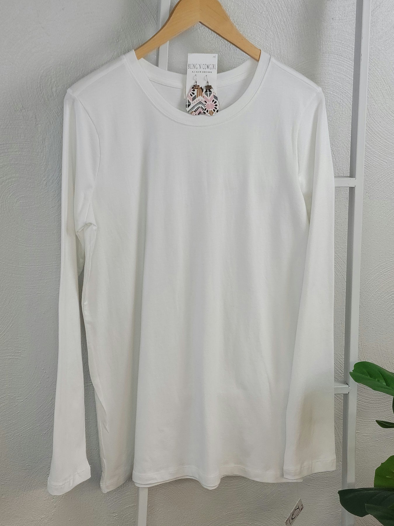 Basic crew neck, long sleeve shirt, available in several colors. This basic is perfect for layering under cardigans and sweaters this season.