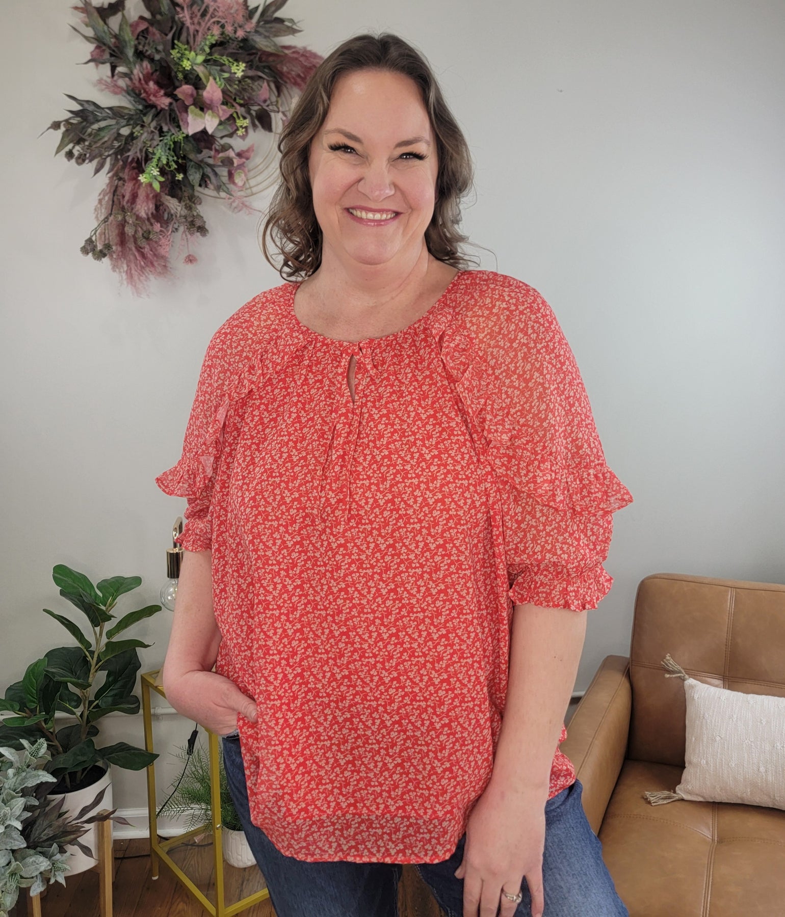 Red floral top with pretty ruffle sleeves is the perfect spring look for when you want to be dressed up! Semi sheer fabric with attached cami for complete coverage. Material is light weight with nice movement but no stretch. Pair this with dress pants or dark jeans and you're ready for work or a night out.