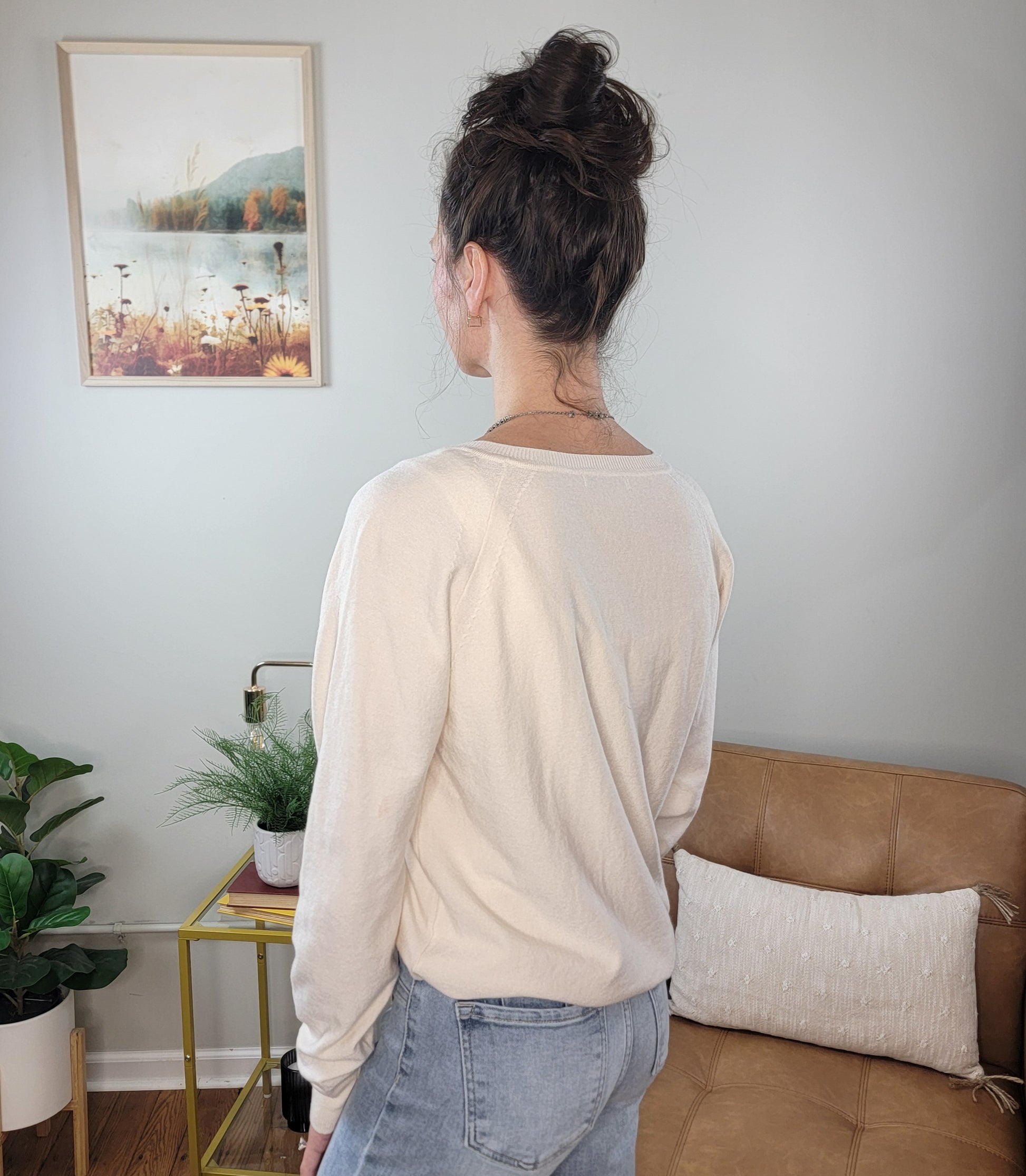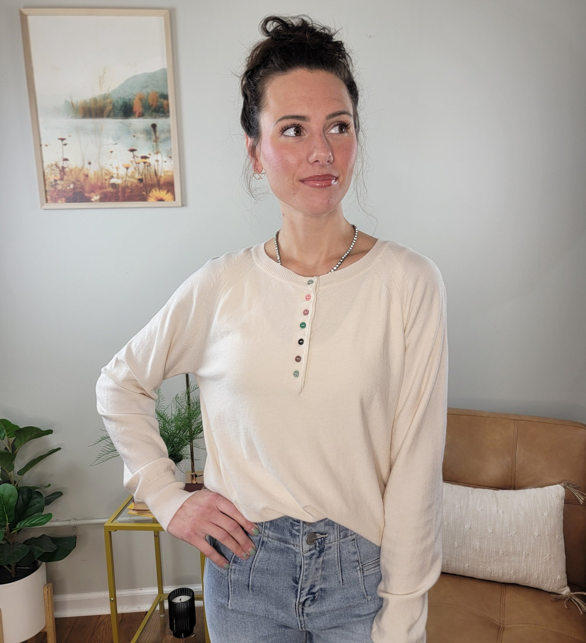 Top is a lightweight knit in a neutral oatmeal color. Featuring a henley neckline and colorful buttons, it adds a splash of cheer to your wardrobe while keeping you comfortable all day long.