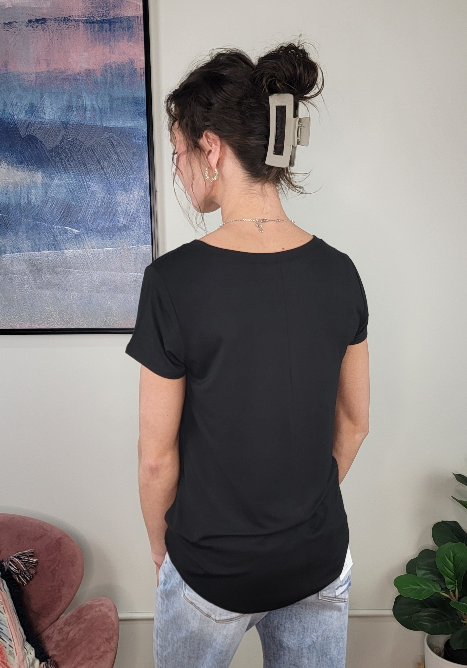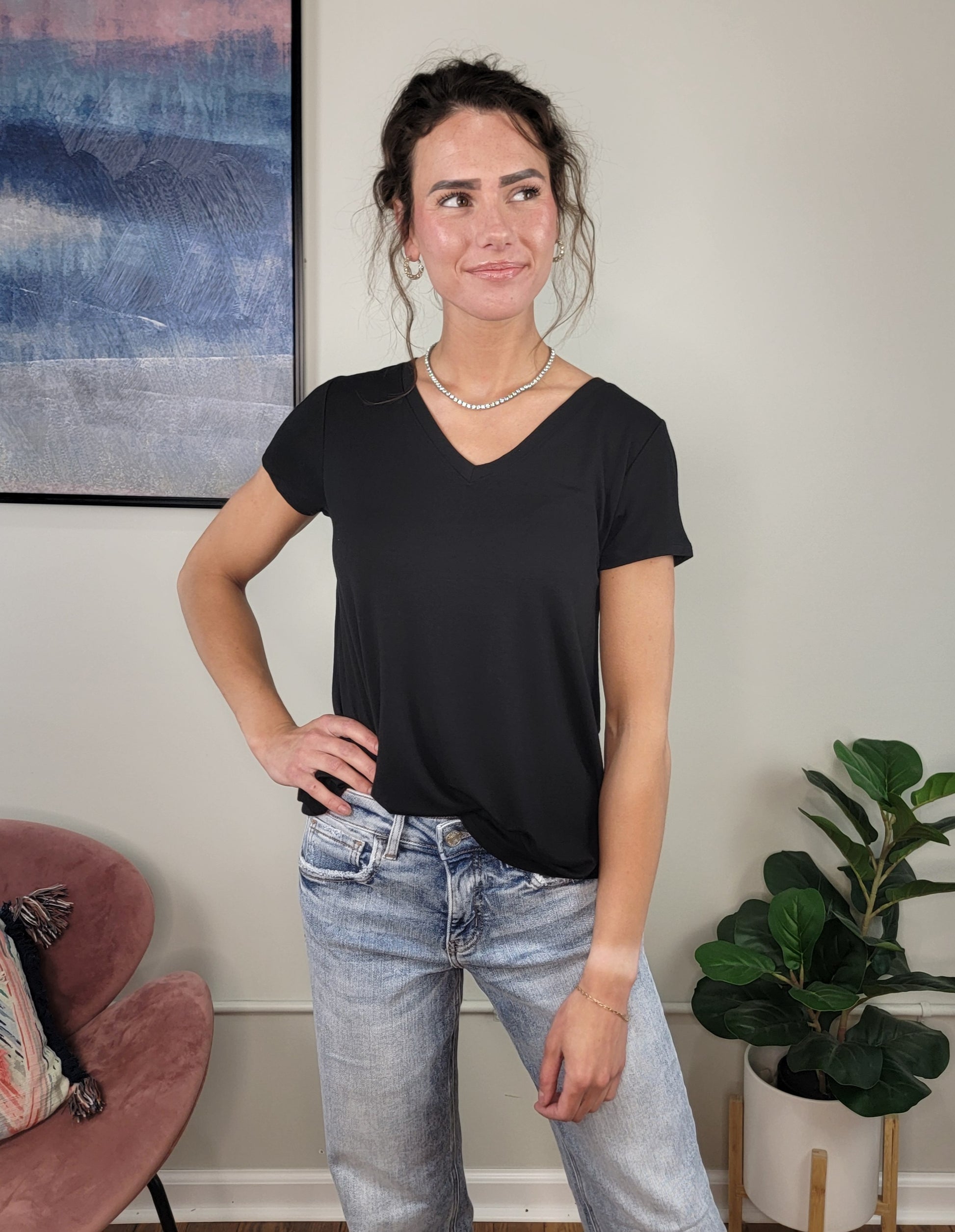 Basic v-neck tee in a soft, stretchy fabric and relaxed fit.