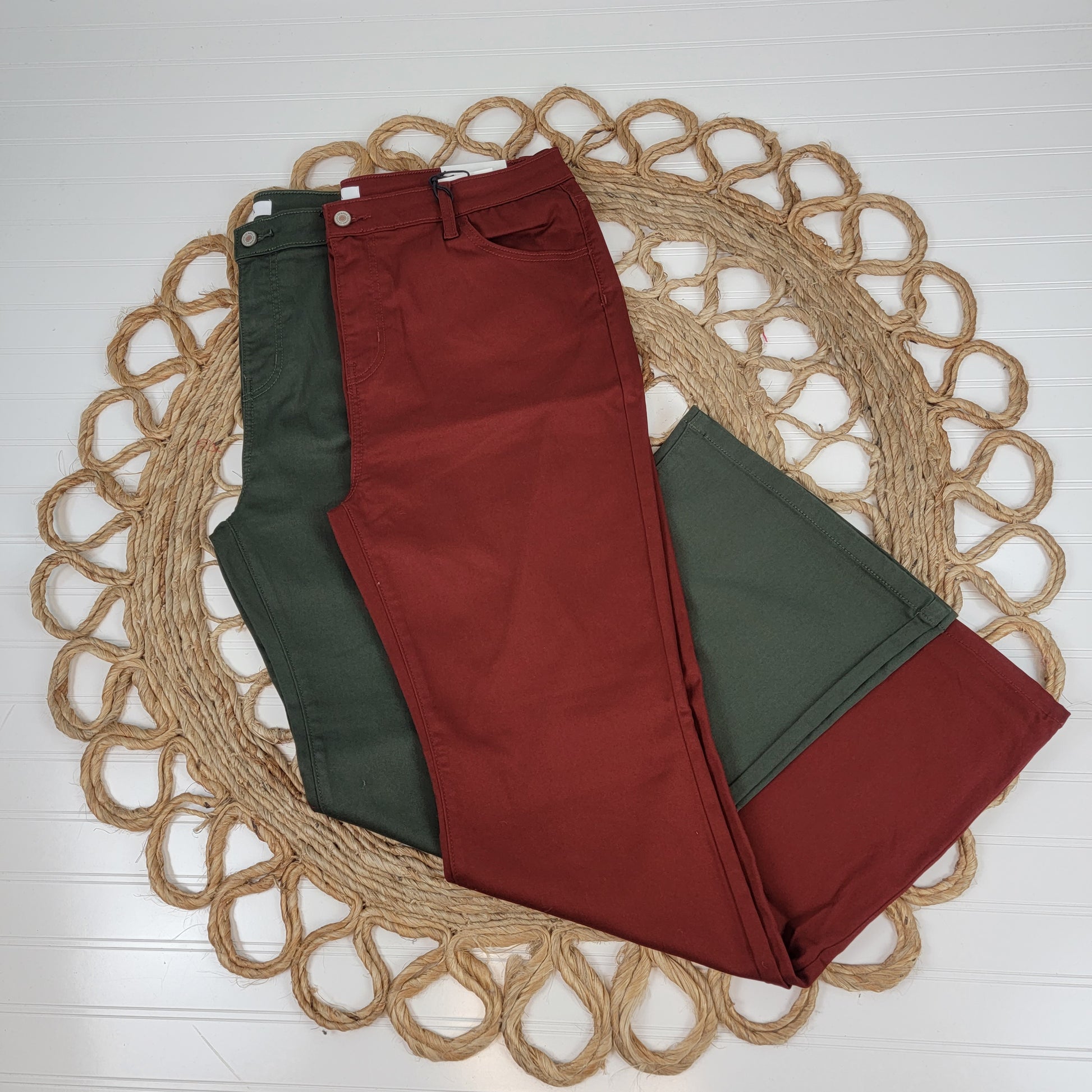 High rise, bootcut, colored jeans with great stretch! Jeans have a 5-pocket design with single button and zip closure. Available in extended sizes in either Olive or Rust or in small-XL in black.