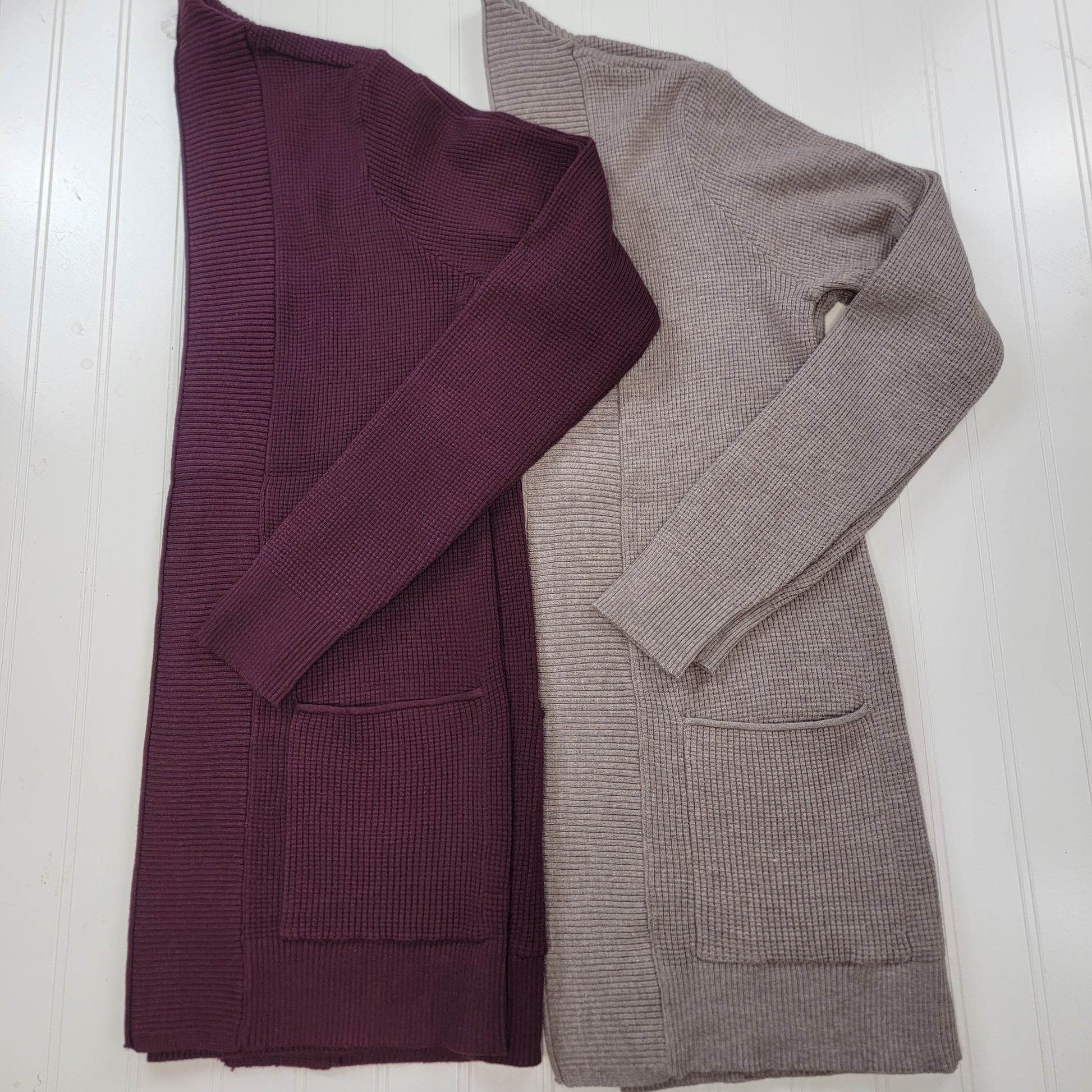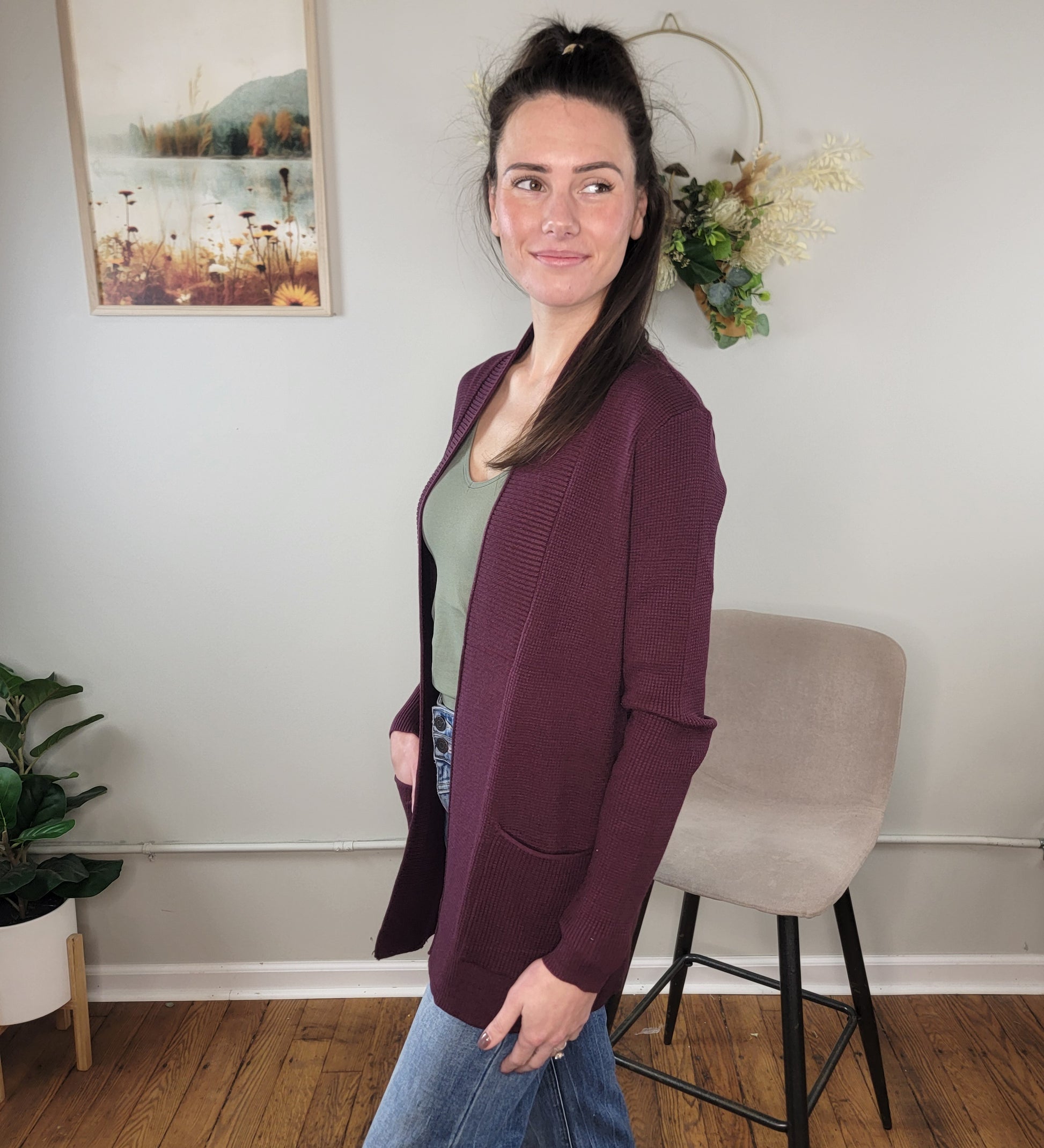 This open front, waffle knit cardigan is available in either dark plum or mocha and features two front pockets. Medium weight knit with nice stretch that's great for layering this season.