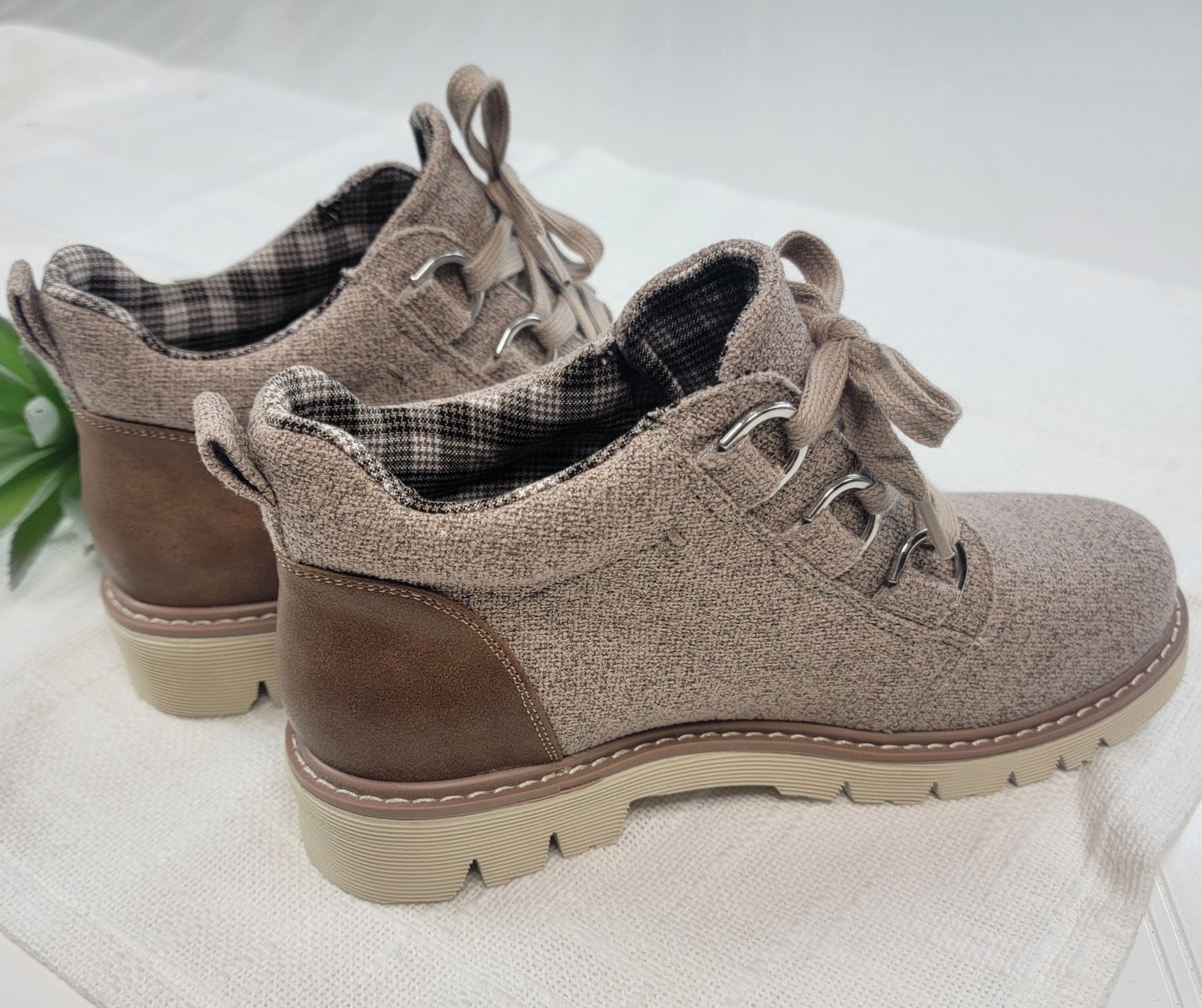 Tan, lace-up boot from Corky features a textured knit upper with contrast suede heel patch. These boats will keep you warm all fall as they have a soft plaid lining for warmth and style, and a cushioned insole for an all day, comfortable wear! Fit true to size.