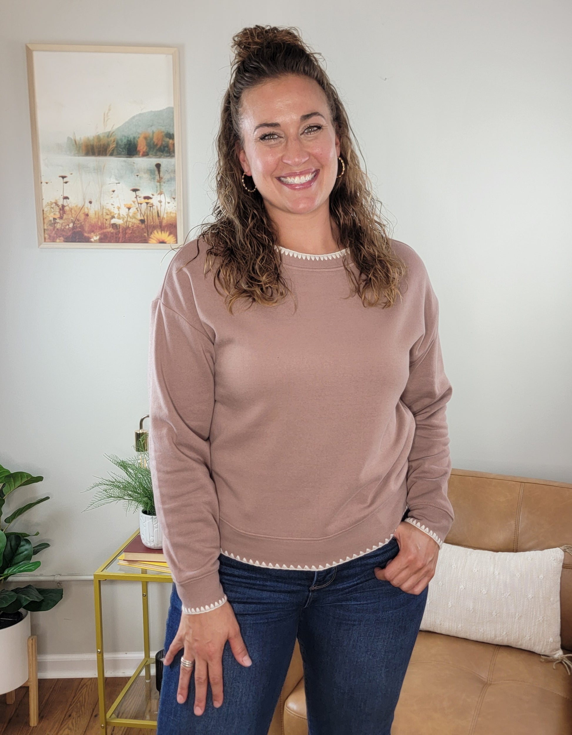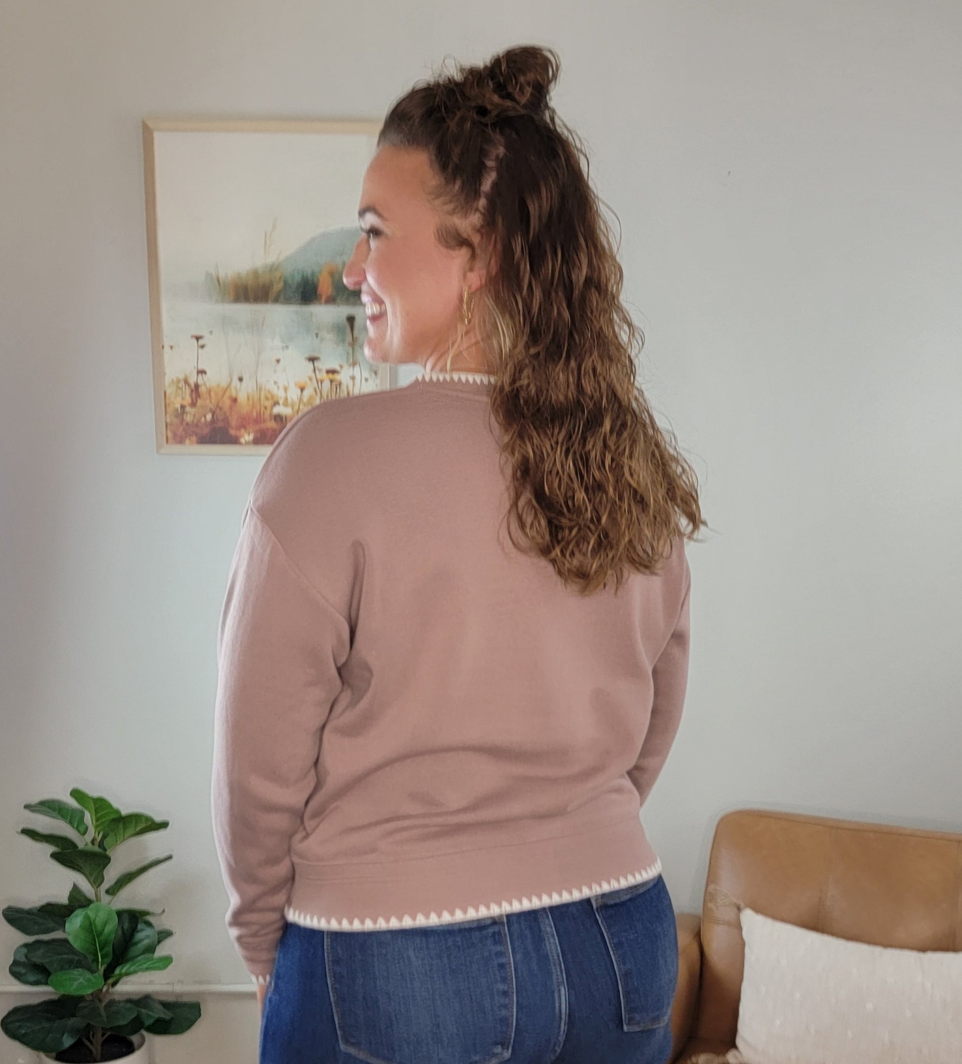This incredibly soft mauve pullover sweater has contrasting stitching at the collar, cuffs and hems that takes a the casual vibe up just a notch. Medium weight makes it great for cooler weather and something that can be layered with jackets and shackets as well.