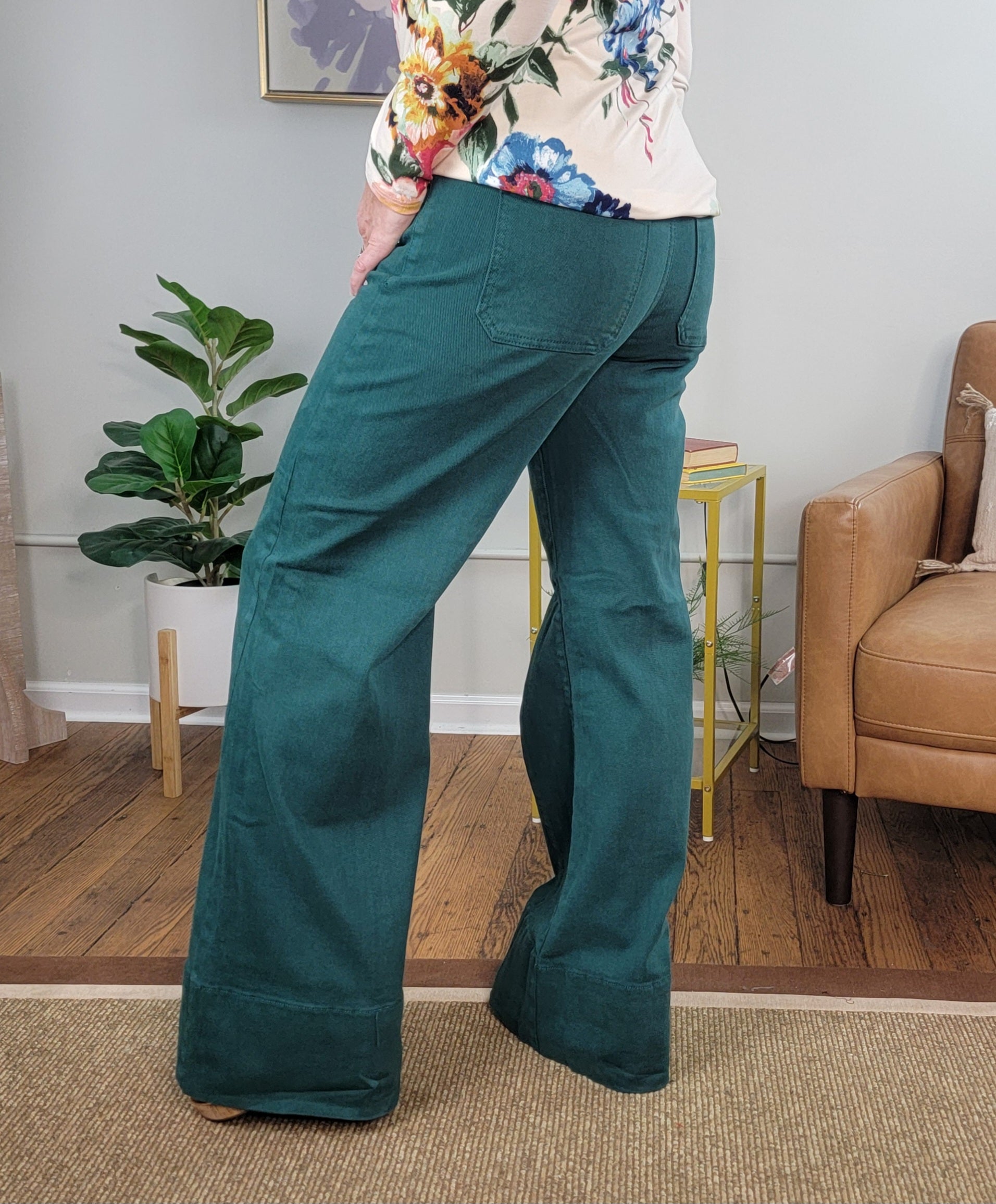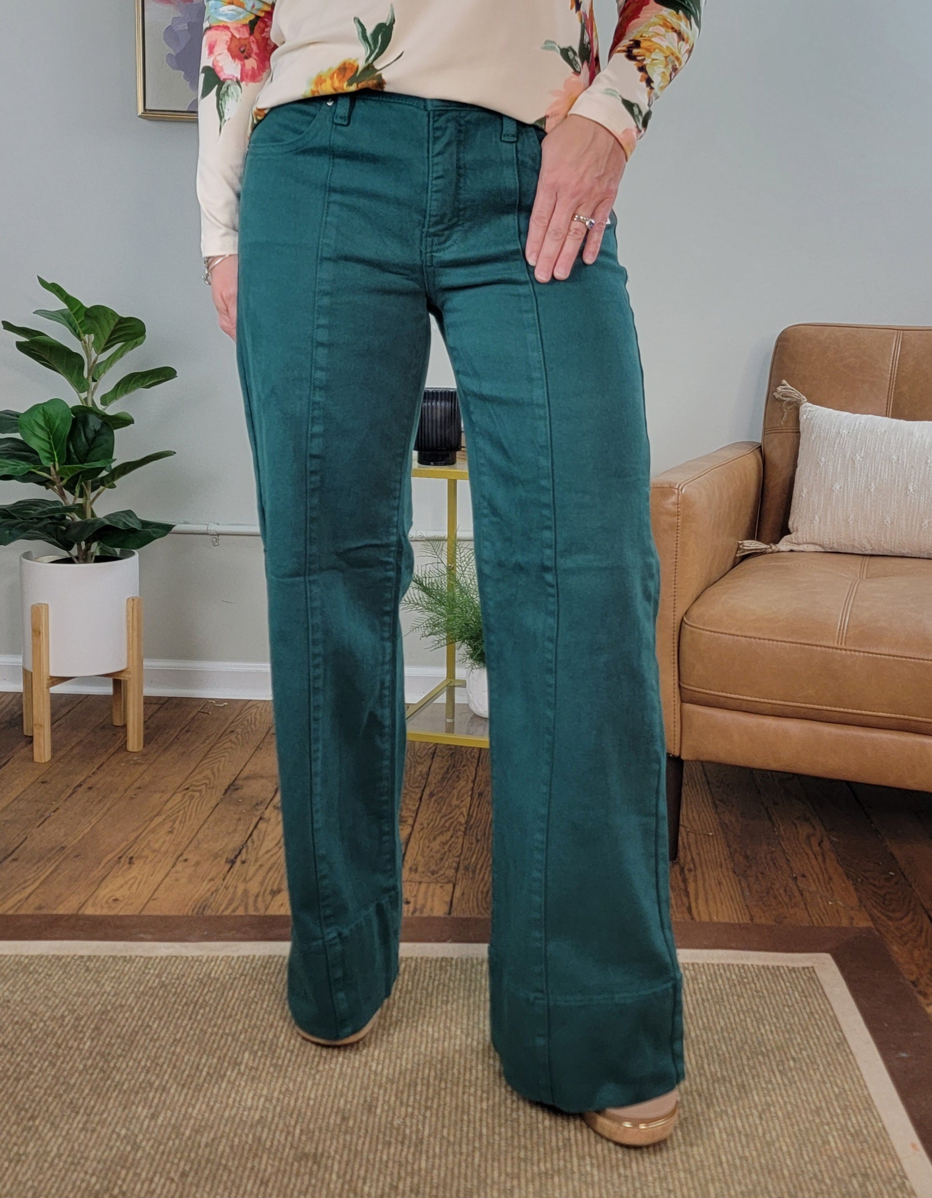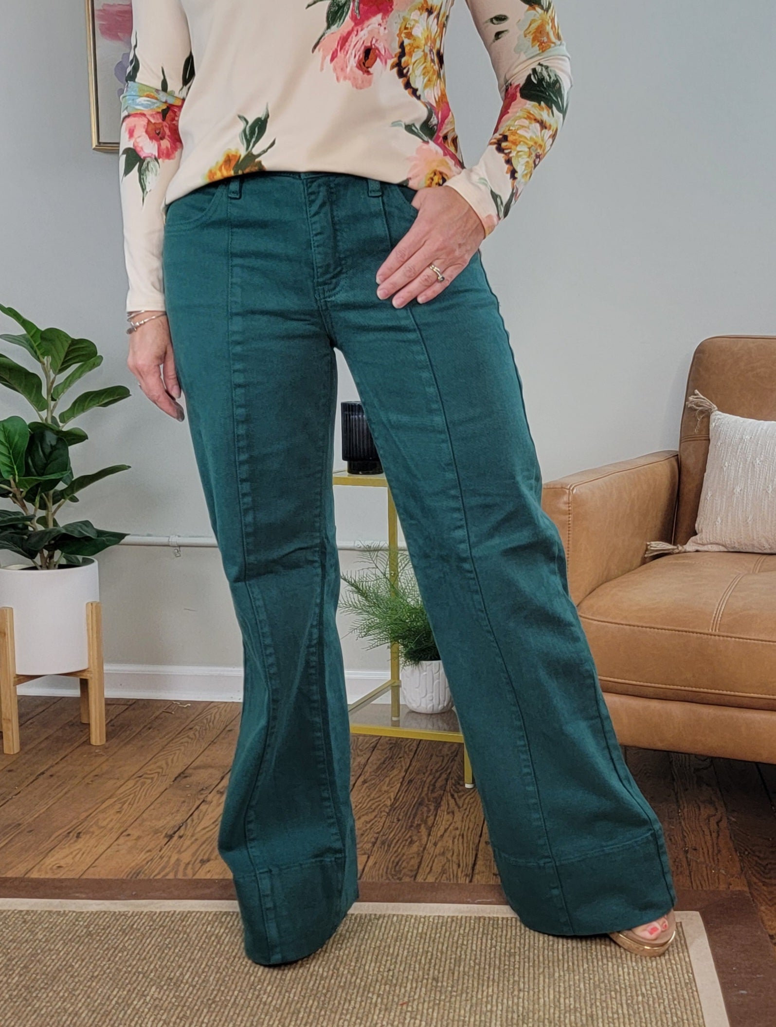 Mid rise, wide leg jeans from Risen in a dark hunter green. Jeans have built in tummy control and comfort stretch denim. They feature a wide hem for a polished look and a front seam adds extra detail. We are loving this one for fall and winter!