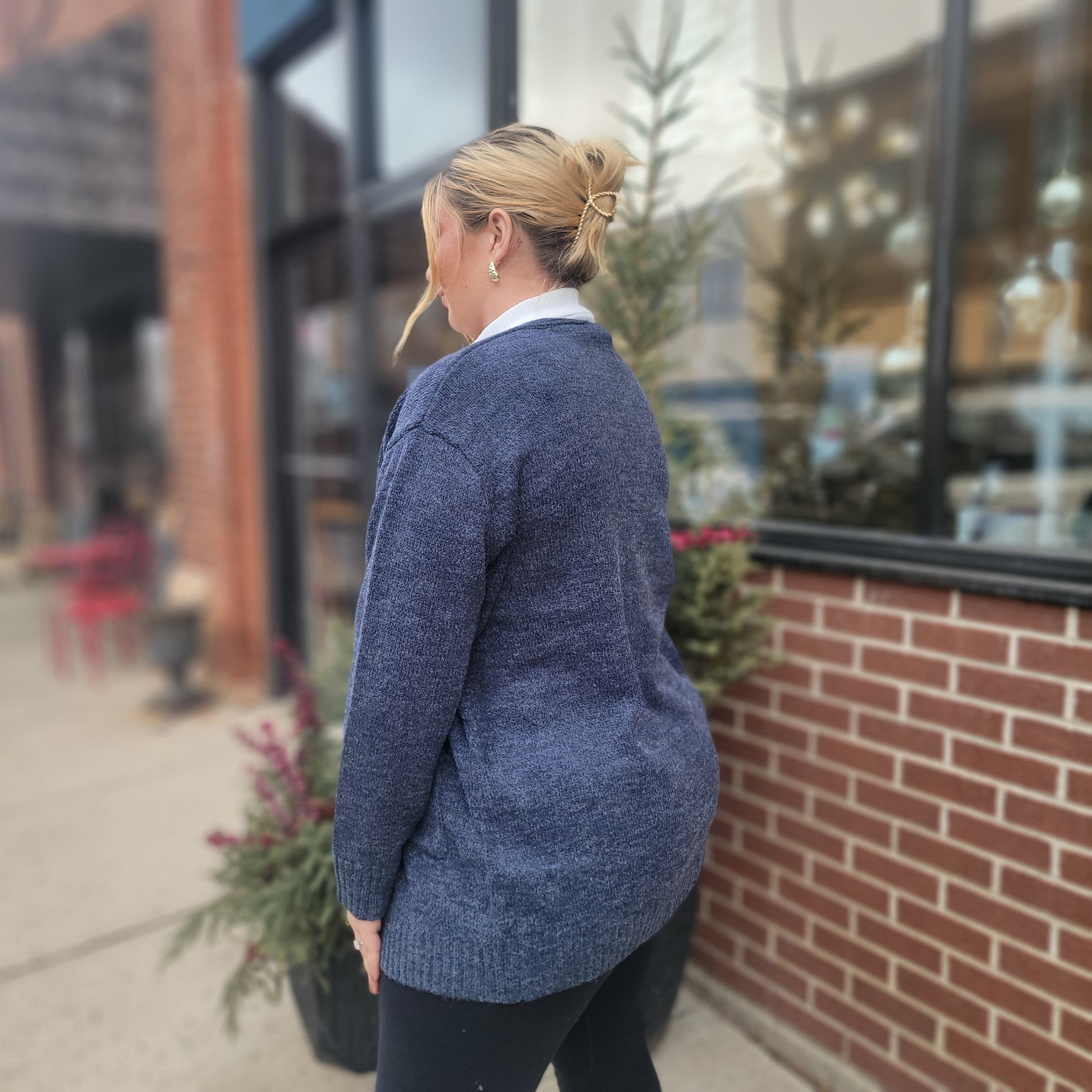 Open front, navy knit cardigan with side pockets. Mid length, the material is a medium weight with nice stretch and perfect for layering this season. We recommend your typical size.