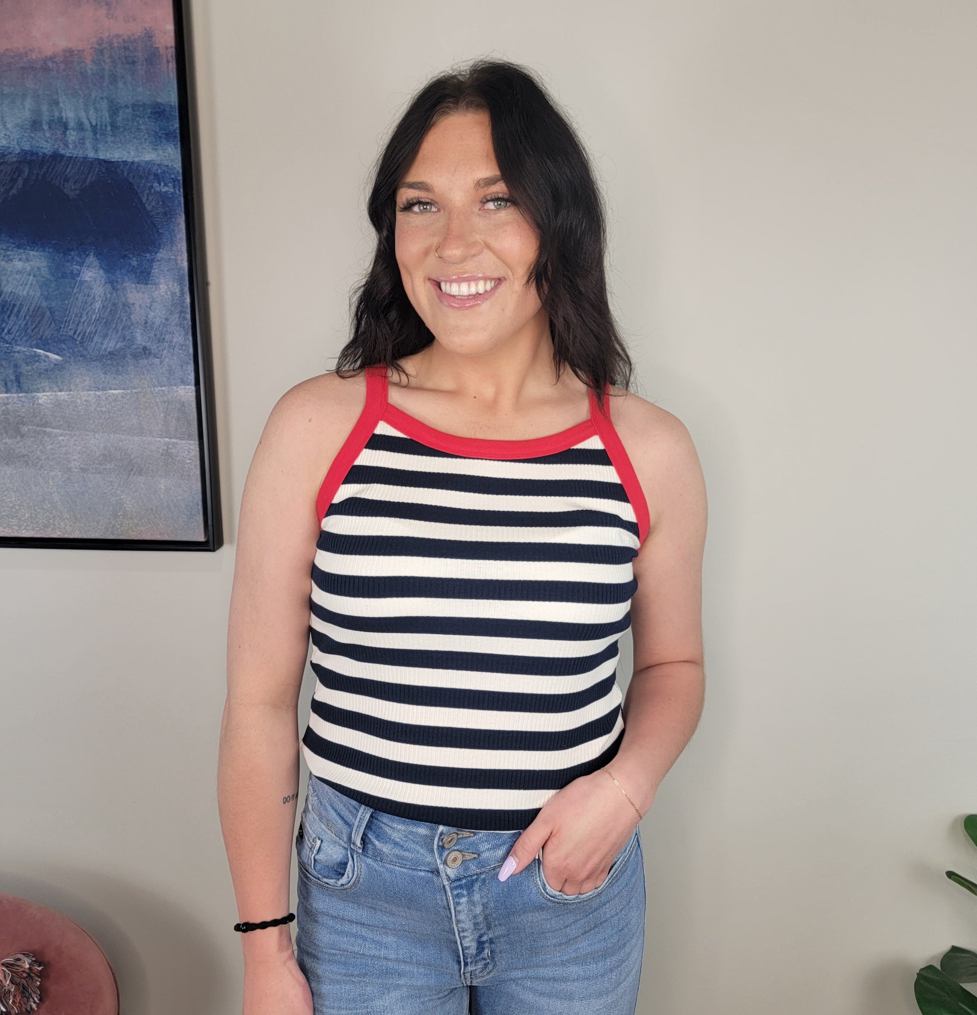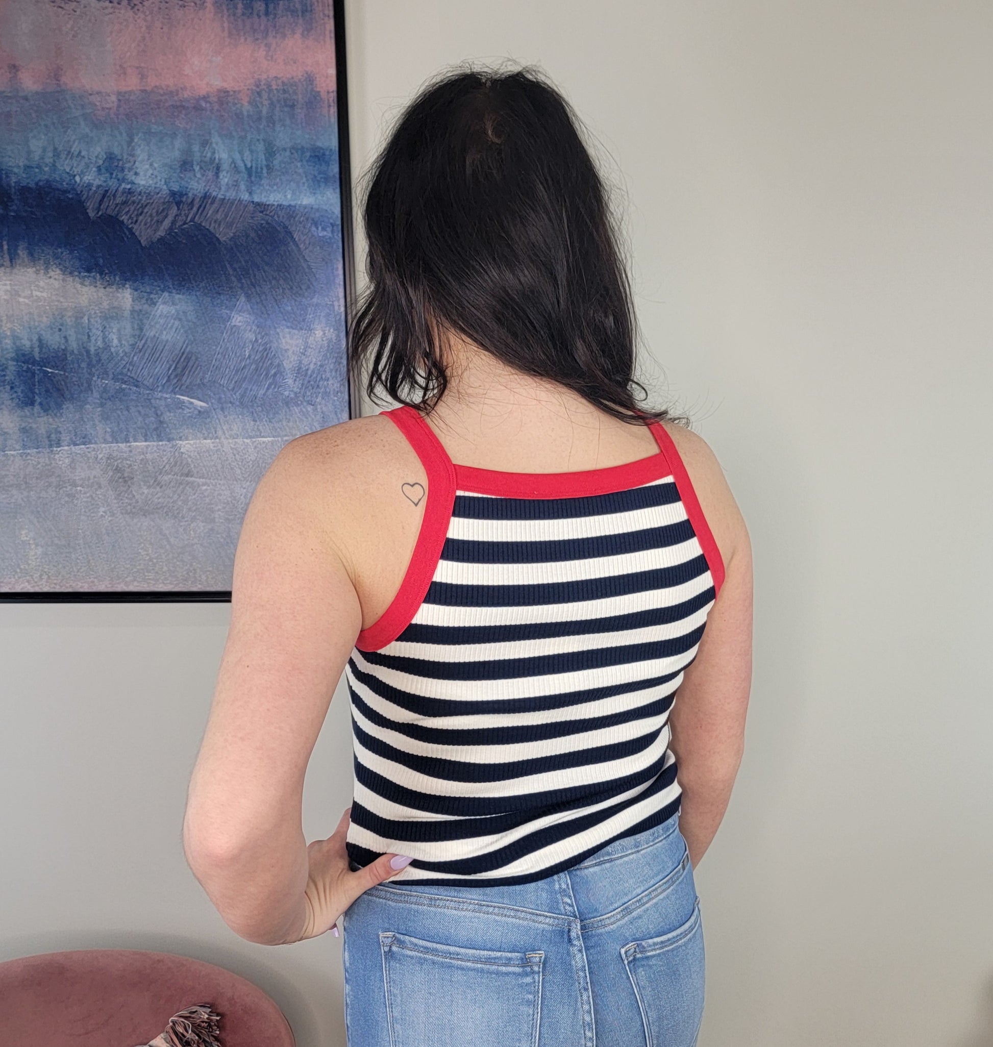 4th of July striped tank top in navy and white stripes with contrasting red details. Ribbed material that has a snug fit.
