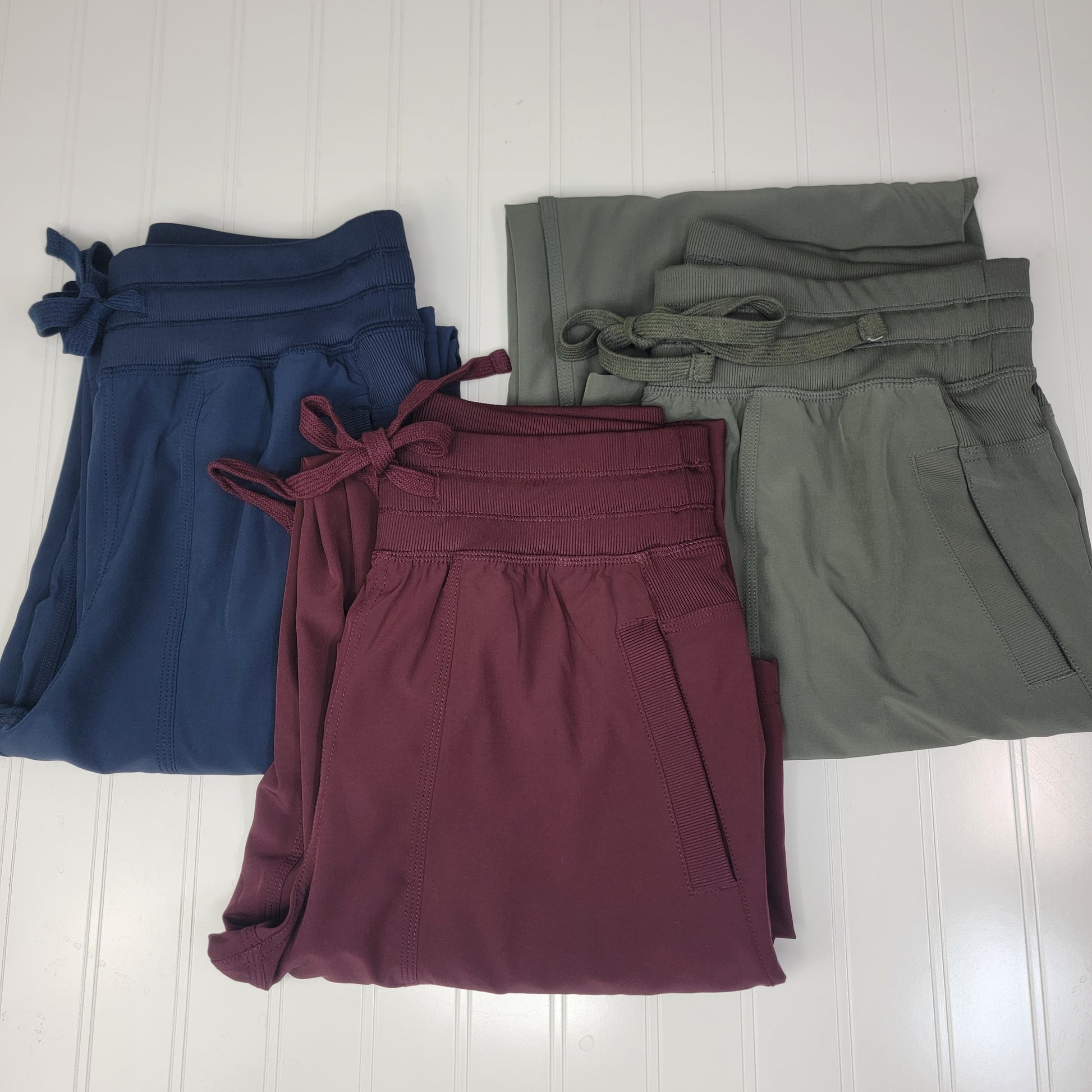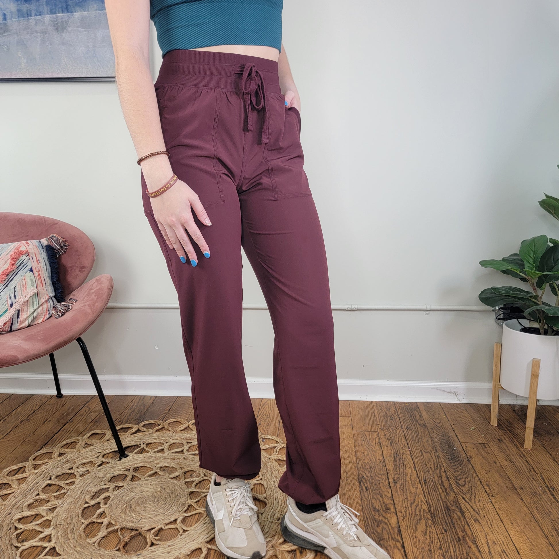 Available in several colors the Dance Studio jogger is a light weight and comfortable option for the gym, studio or running errands. This mid rise, full length pant has an elastic, tie waist and side pockets. Pant hems can be worn straight, or cinched for a cuffed ankle.