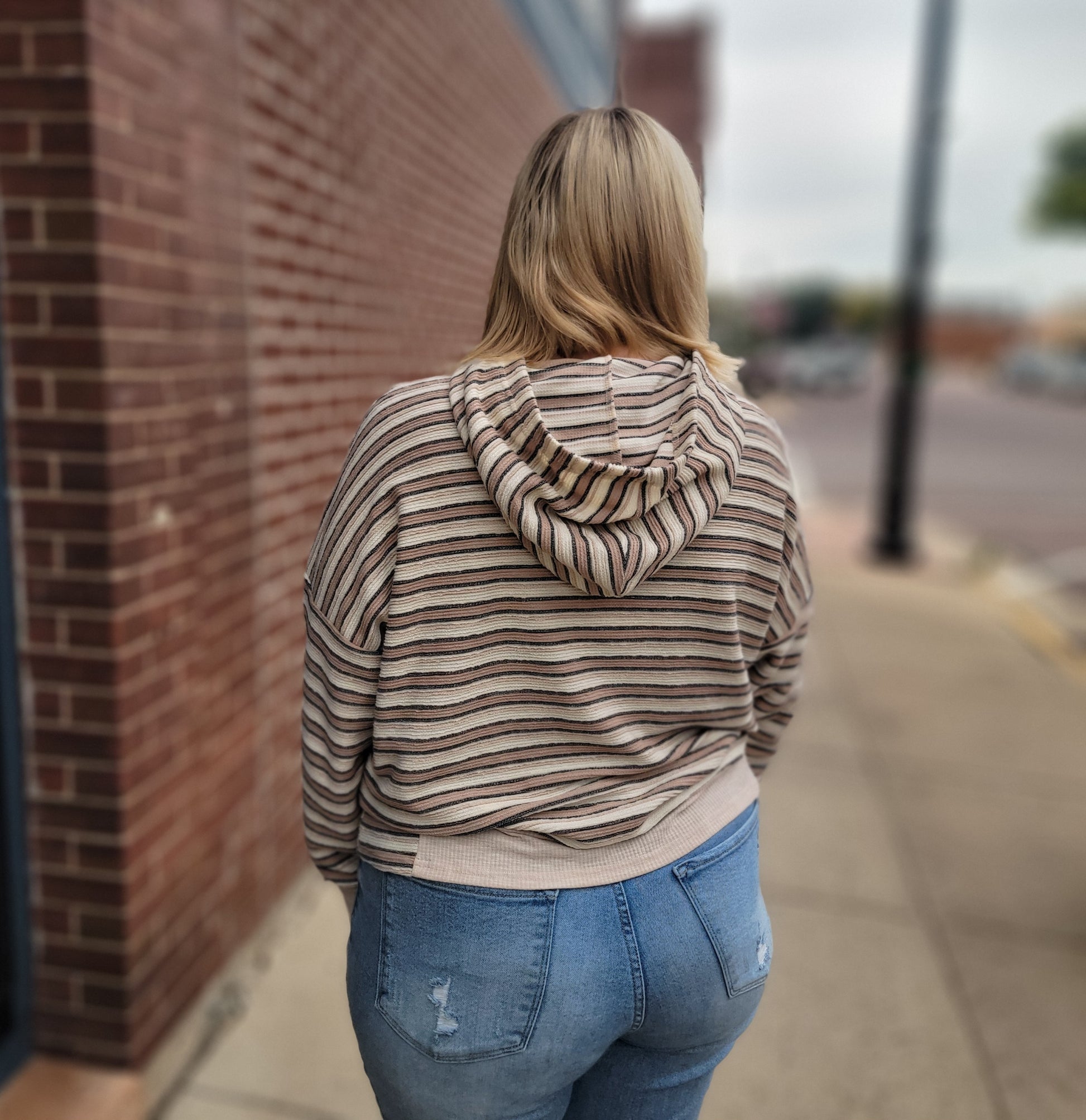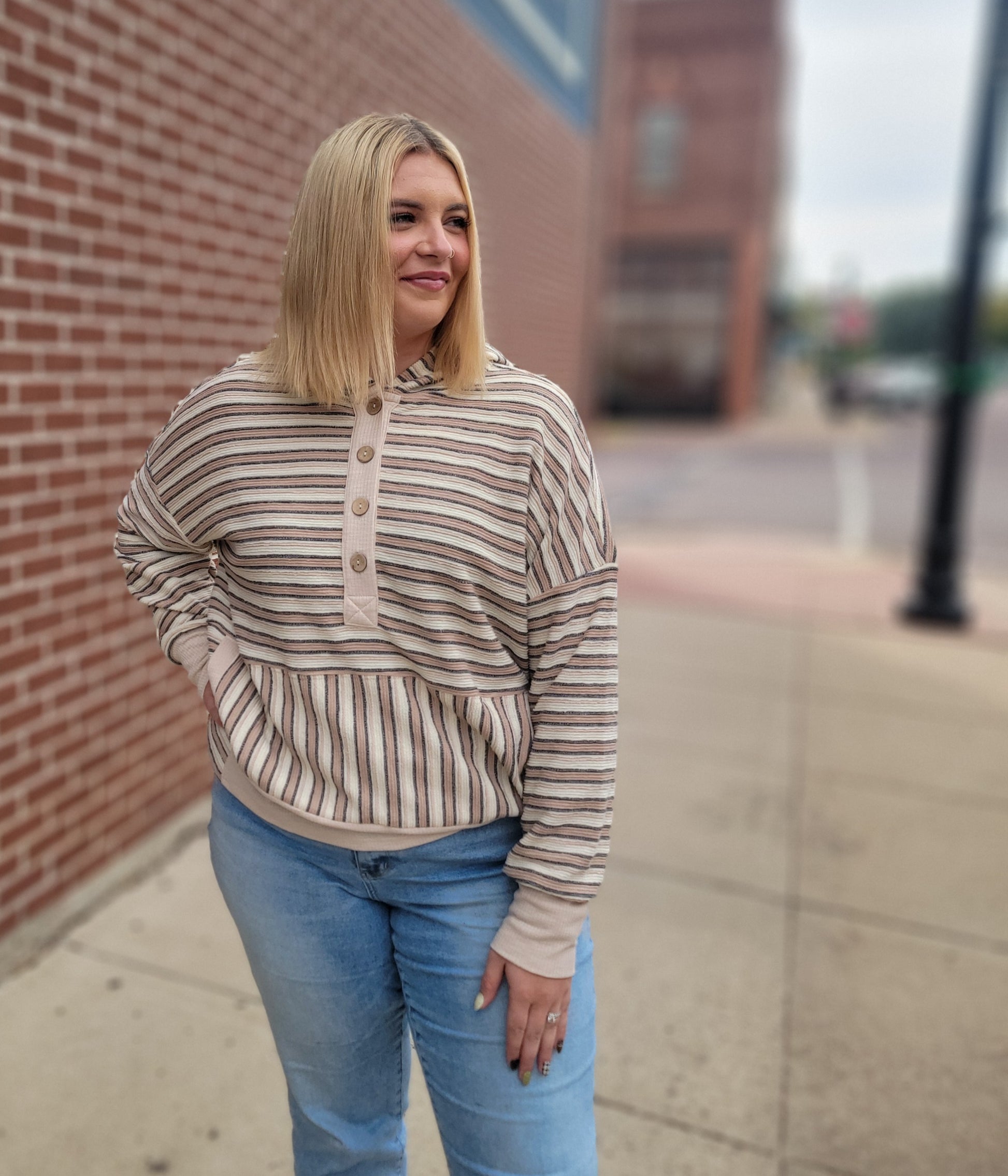 Contrast stripes on a cream hoodie creates a casual and laid back vide. Hoodie has front buttons for easy on and off and for styling, along with a front kangaroo pocket. Material is a lighter weight with nice stretch, making it perfect as we transition from summer into fall.
