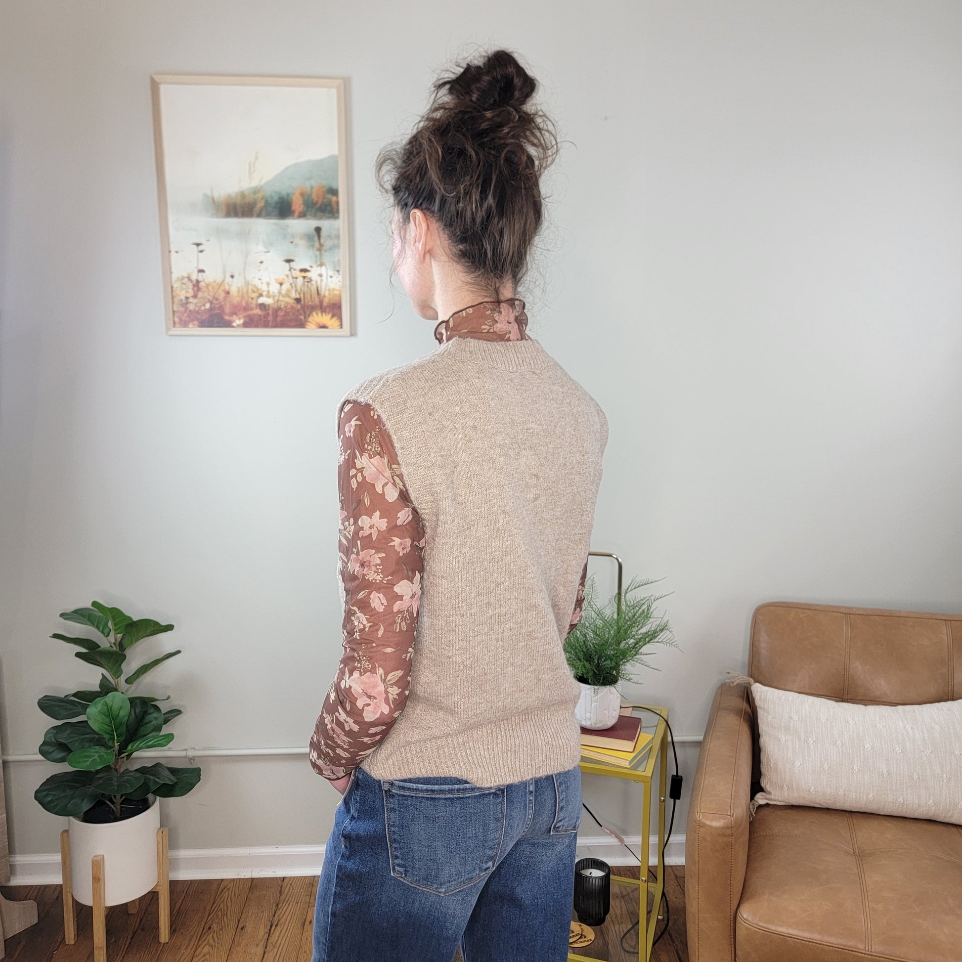 Floral embroidered sweater vest in a soft and neutral mocha. Perfect for layering this season, we love it styled with jeans or dress pants. Medium weight knit with stretch.