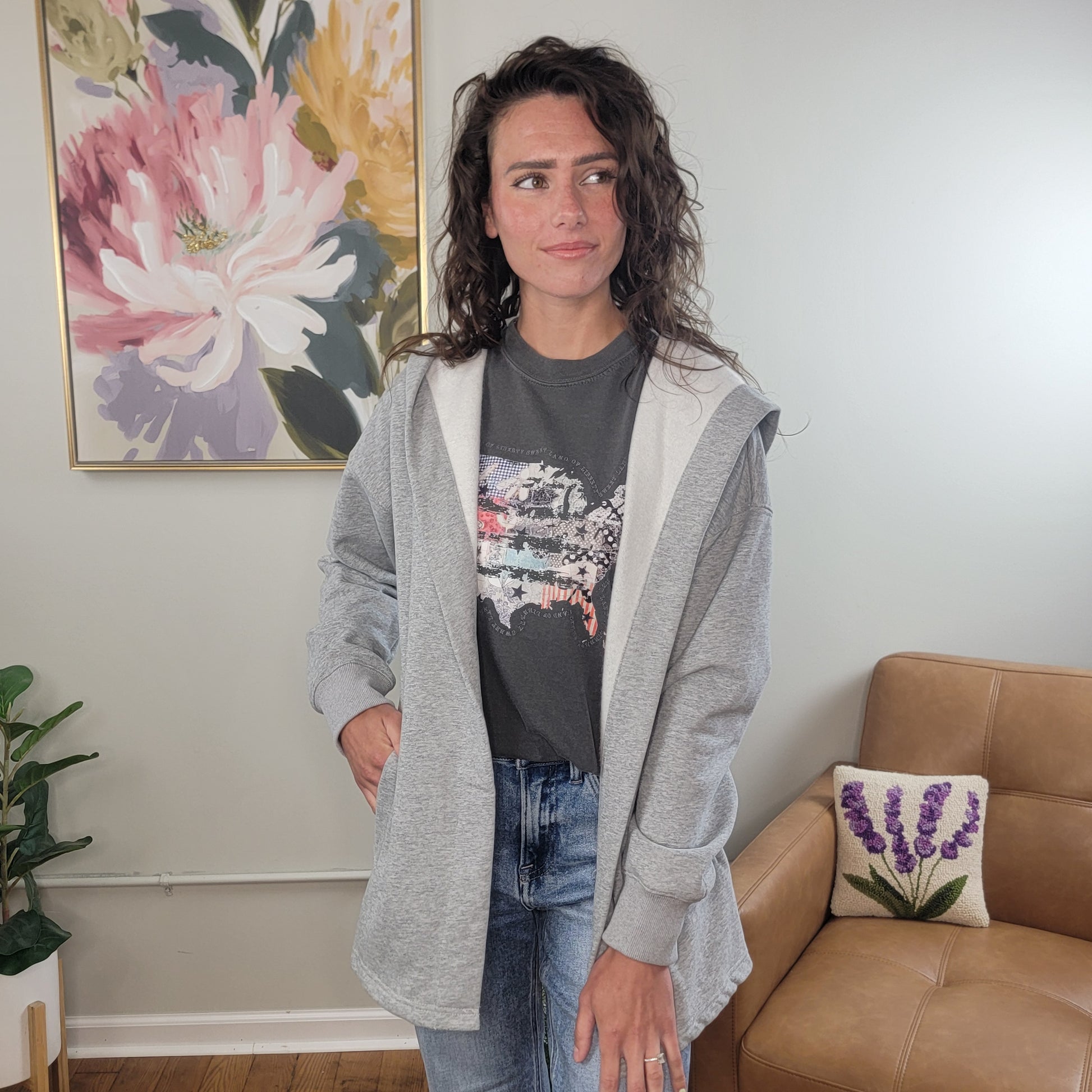 Heather grey, open front cardigan with hood and side pockets. Cardigan has a soft and cozy sweatshirt feel making this a perfect option when you're after something more casual.