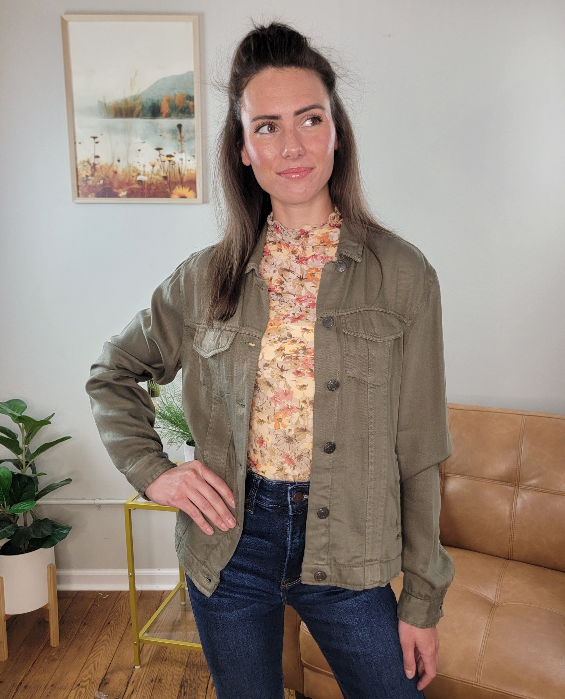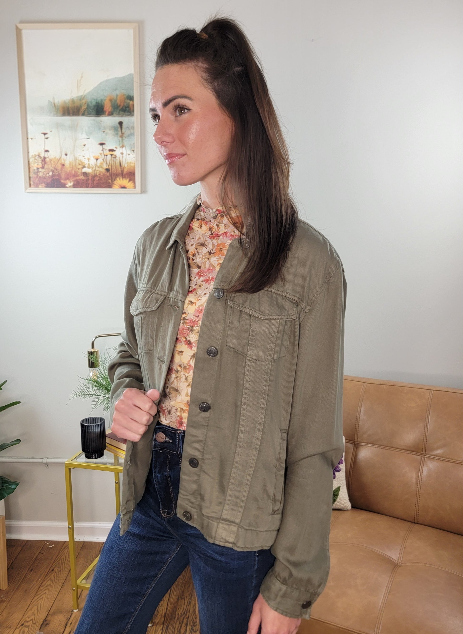 This olive jacket from Thread & Supply is incredibly soft and easy to wear. Not stiff like other jackets might be, this one slides on and feel more like a cardigan! Perfect for layering this season with your favorite tops and denim. Jacket features a button front closure, chest and side pockets.