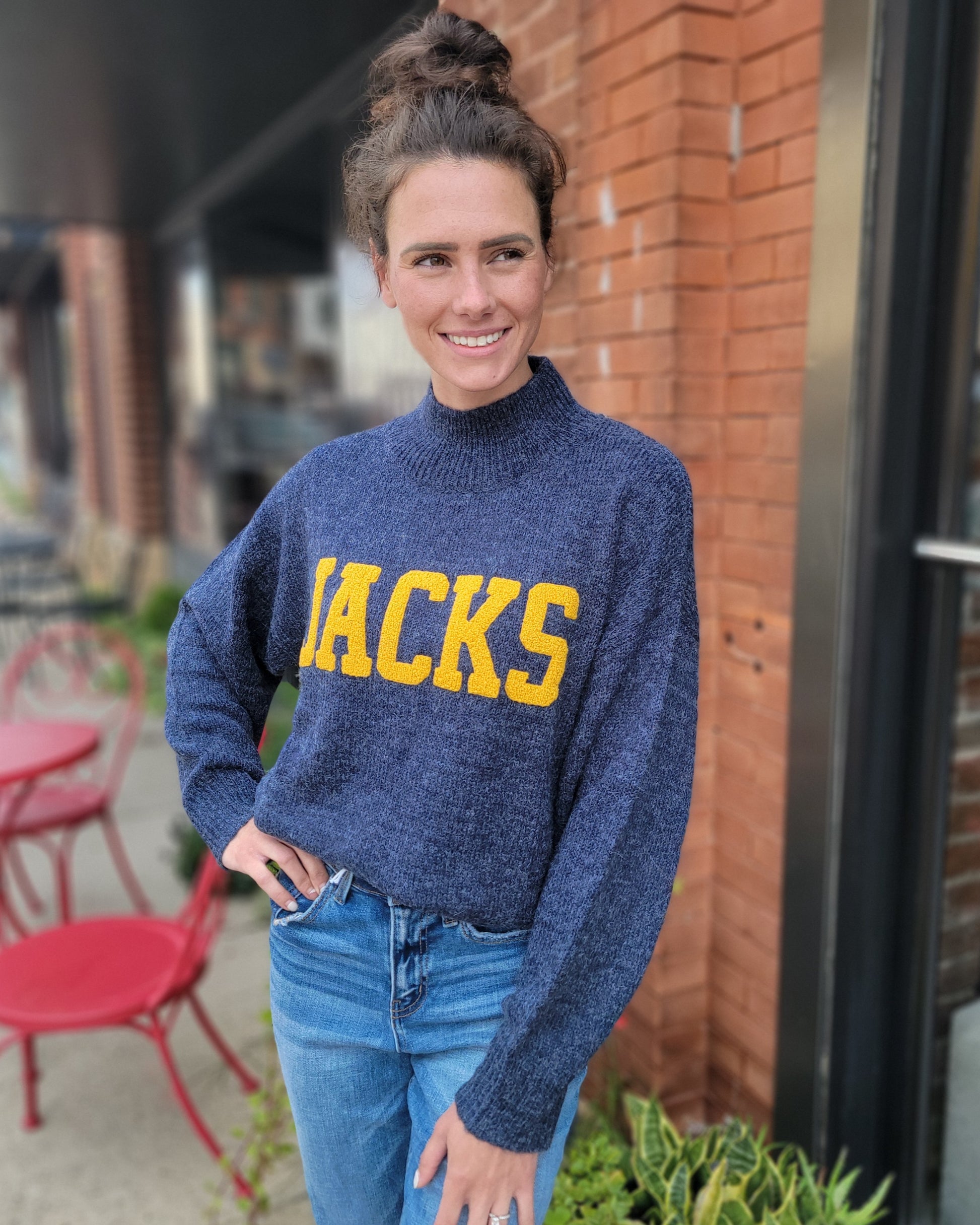 Perfect for chilly game days, this mock neck sweater in blue has "Jacks" in chenille across the front.