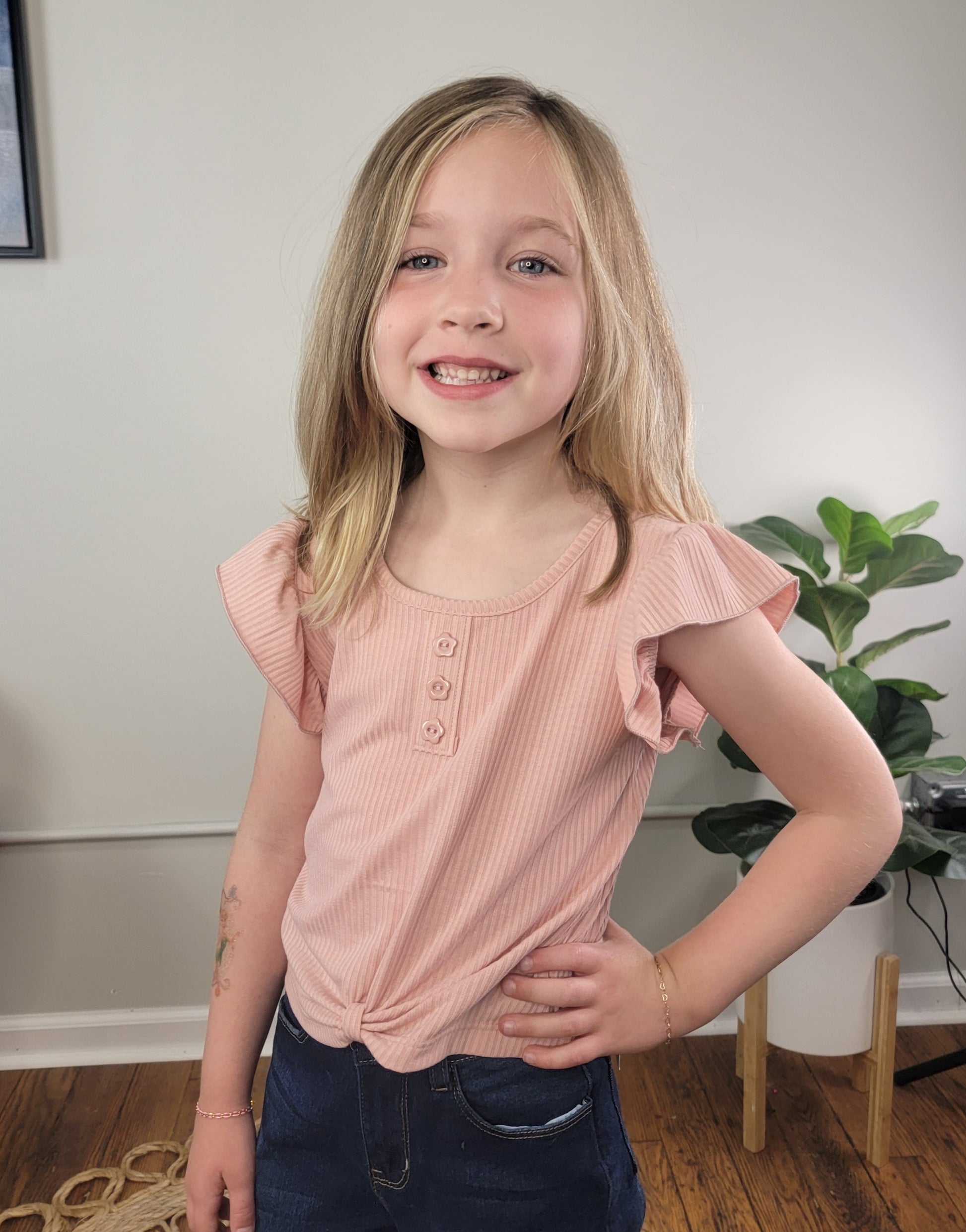 Pretty in pink, in this knot-front top. Flutter sleeves with button front details. This one is great on it's own, or styled under jackets and cardigans. Material is soft with nice stretch. We think this one fits true to size.