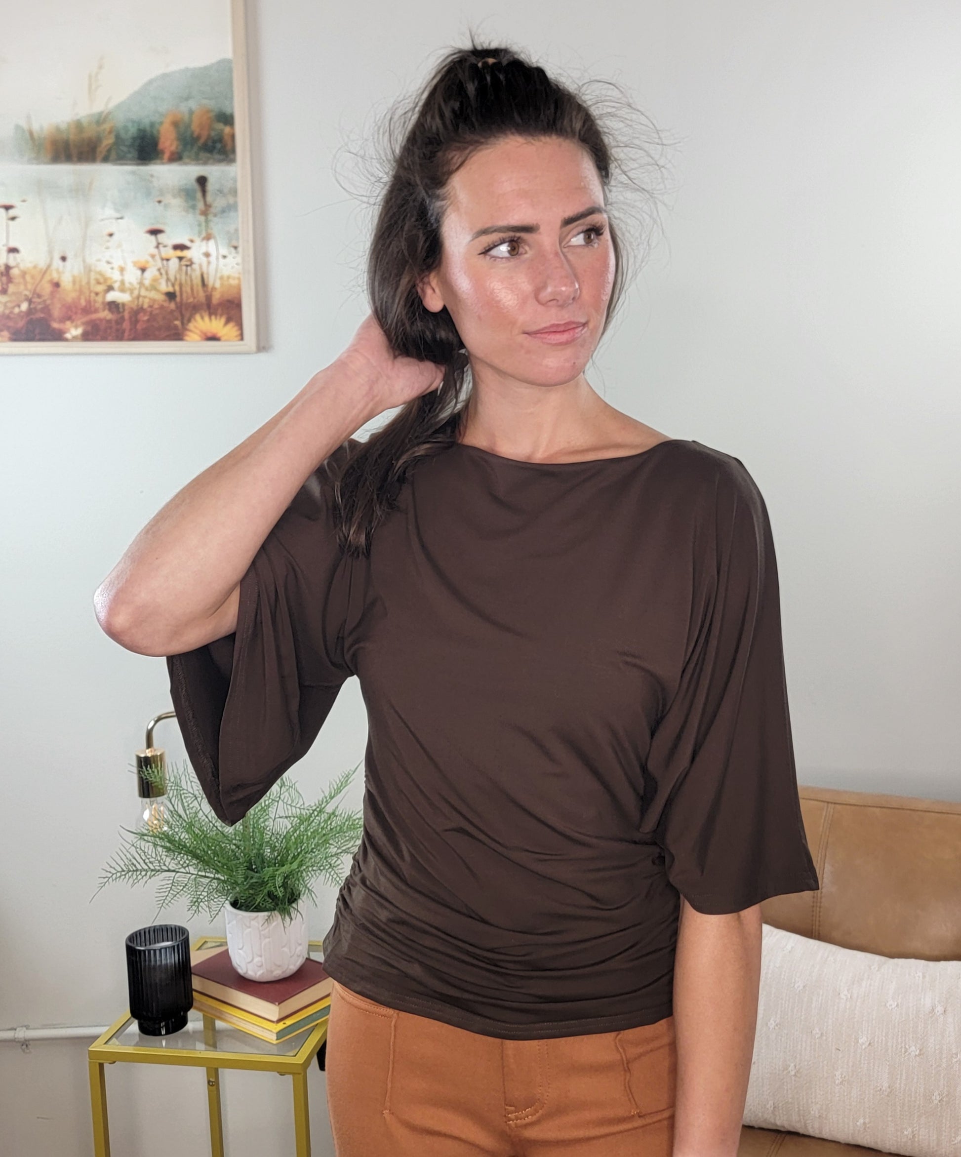 Made from a soft, double knit this top has wide, flowy sleeves and a cinched sides for an elevated and flattering fit. Easy to style on it's own with pretty jewelry, we are loving this one for dressier occasions this season.