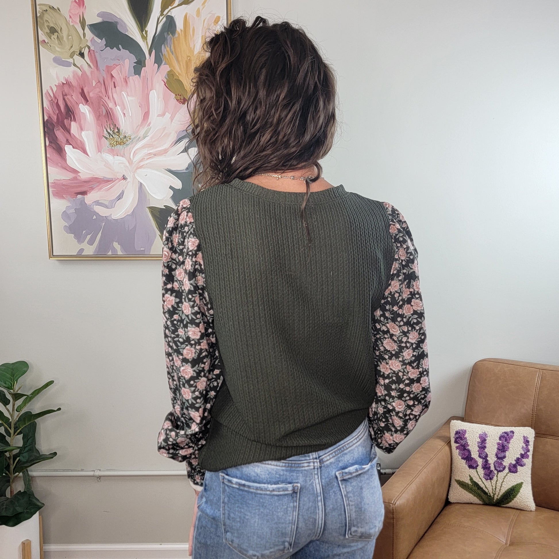This long sleeve blouse has an textured knit body in dark olive and a pretty floral sleeve with smocked cuff. The body of this top has nice stretch, but not the sleeve.