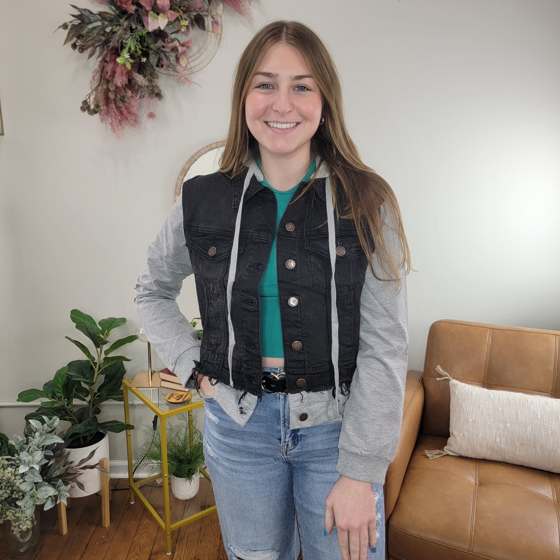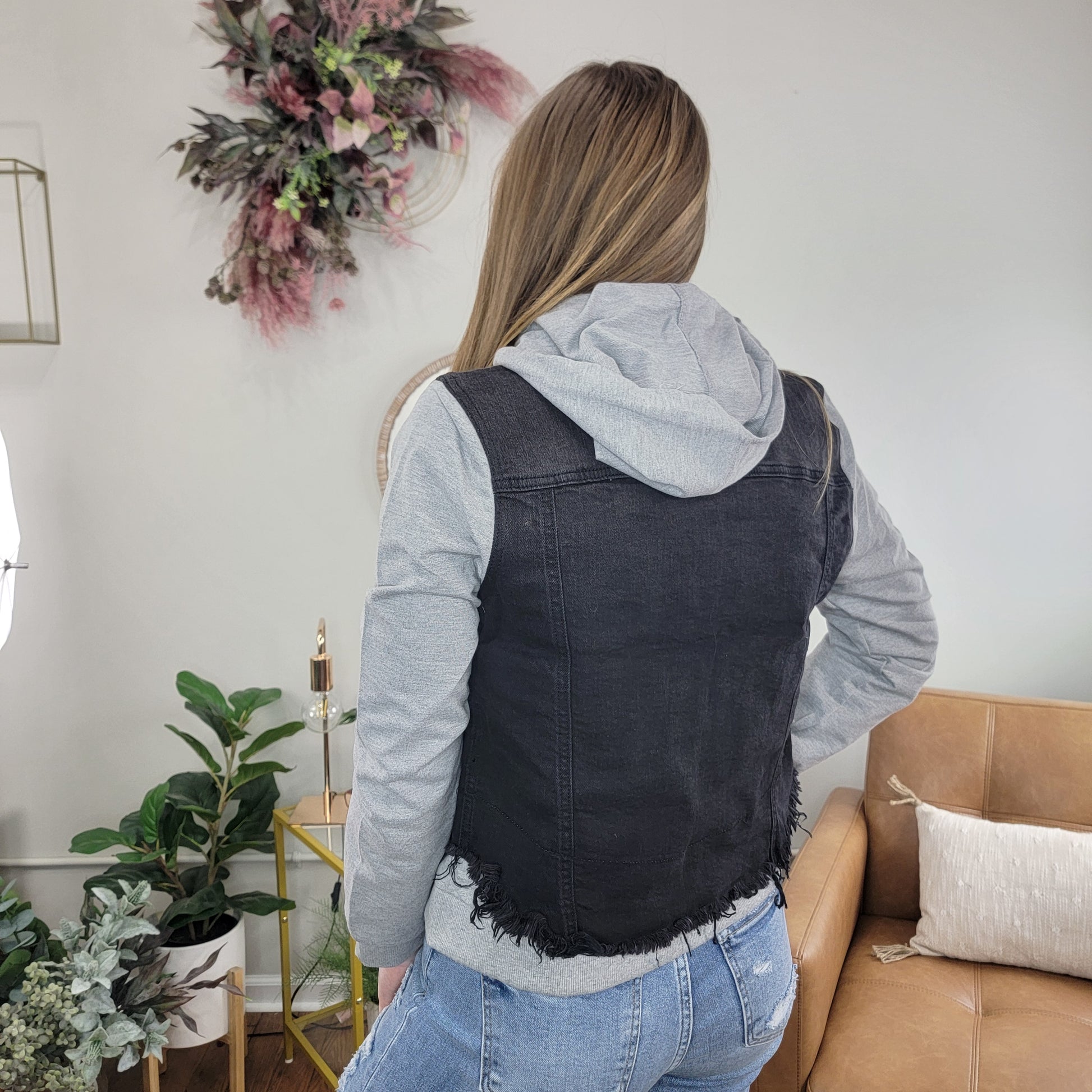 Hooded denim jacket with sweatshirt detail at the hood, sleeve and waist. Removable hood and small side pockets. Black denim features distressed and frayed hem details adding to the relaxed and laid back feel of the jacket. Jacket does have stretch, but we think this runs small, so if you are between sizes, or want more room, size up.