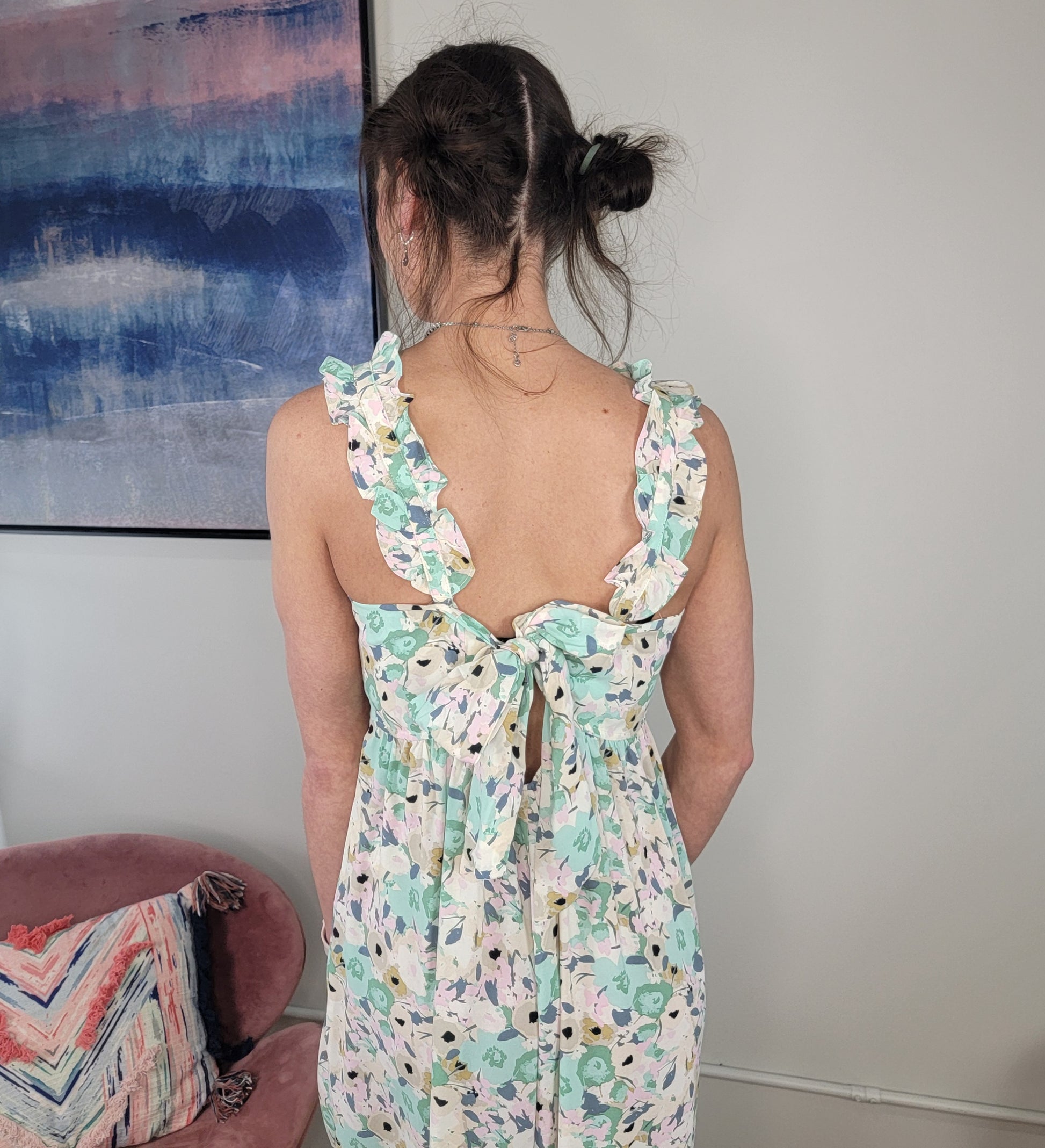 Sage floral jumpsuit with ruffle straps and back tie detail. Material is soft and silky with no stretch, but great movement.