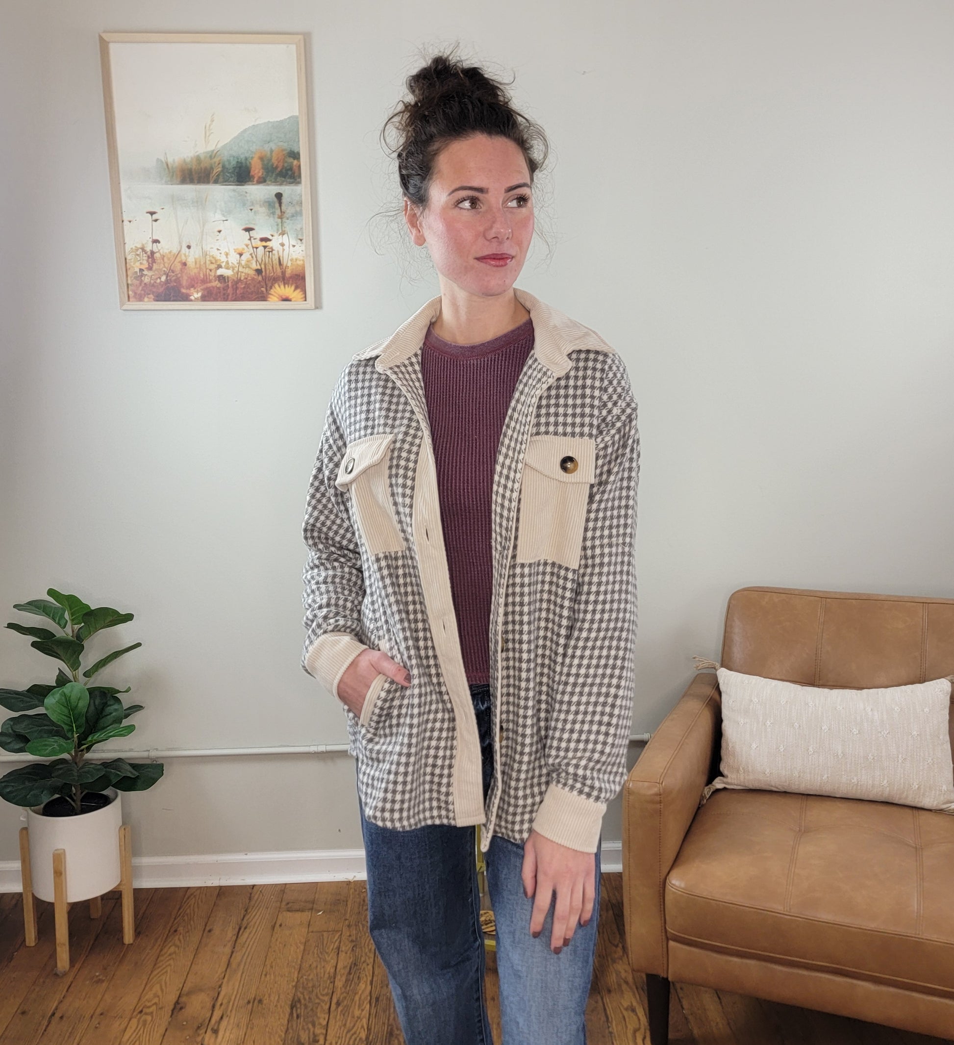 Medium weight shacket in a cream and grey houndstooth with contrasting cream corduroy details. Button front closure with chest and side pockets.