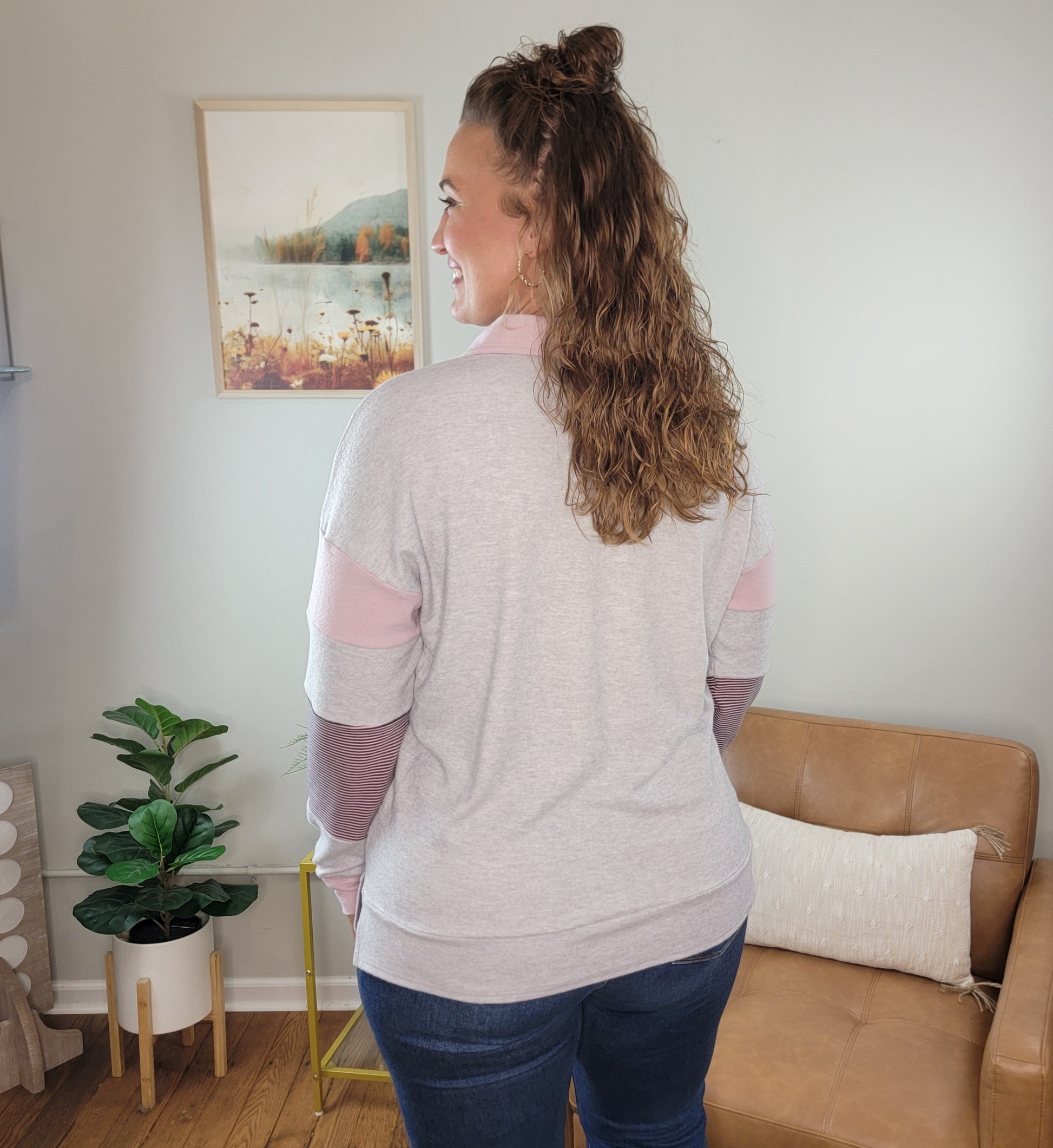 Cozy up in the Paityn pullover, featuring a fun split neck and collar design that adds a playful twist. The color-blocked sleeves and collar bring vibrant pops of style to the soft, fleece fabric, making it perfect for chilly days or casual hangouts where comfort meets cool.