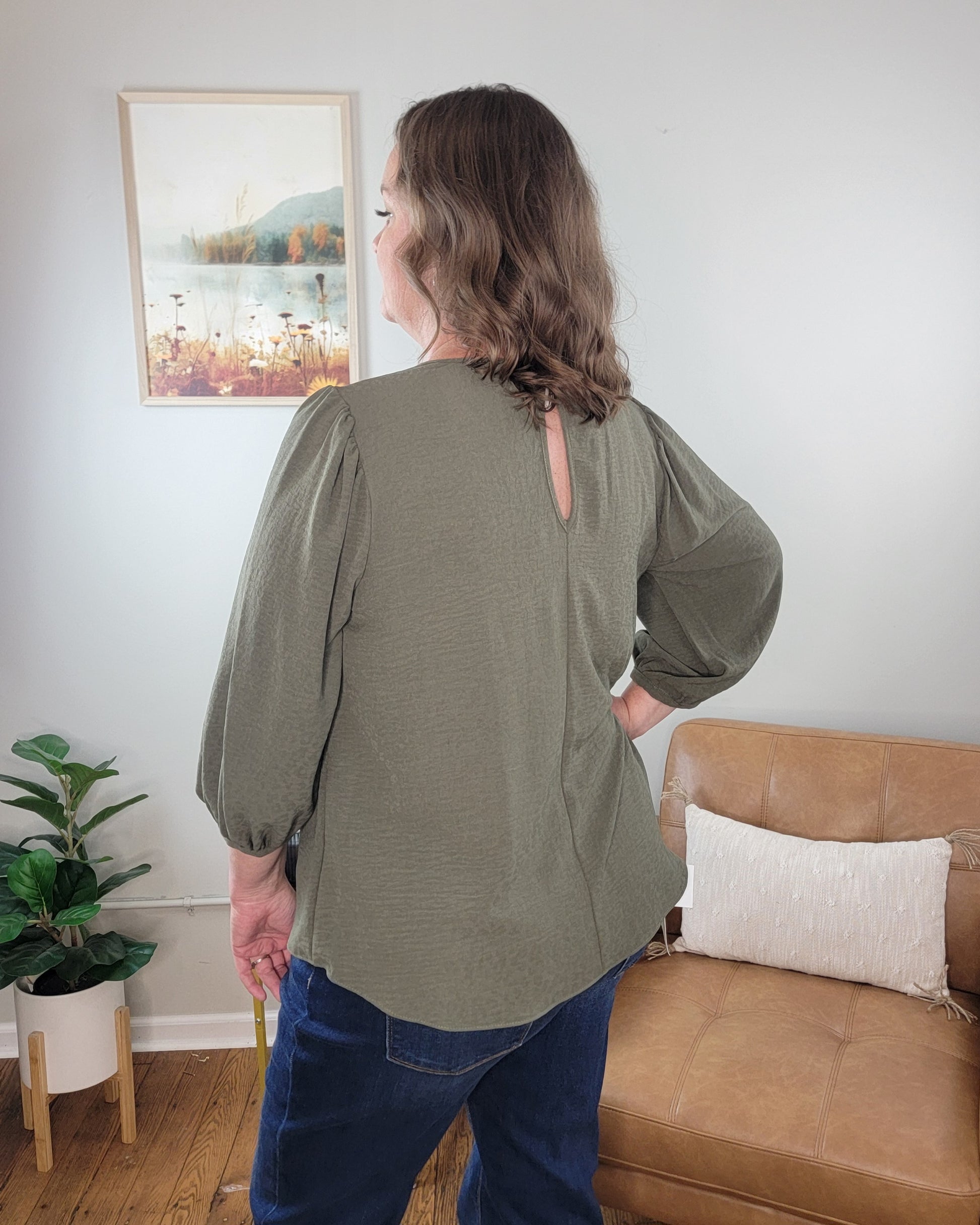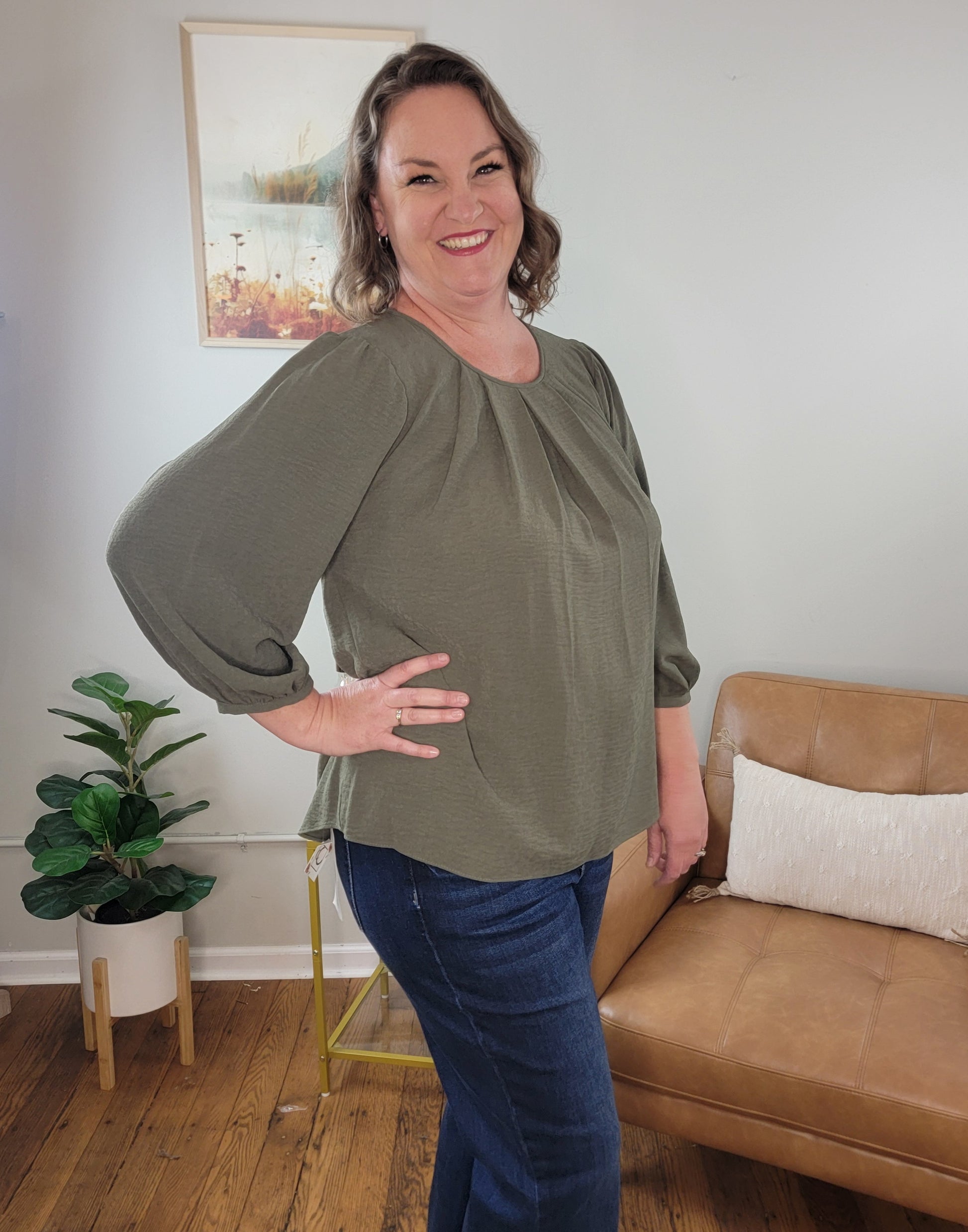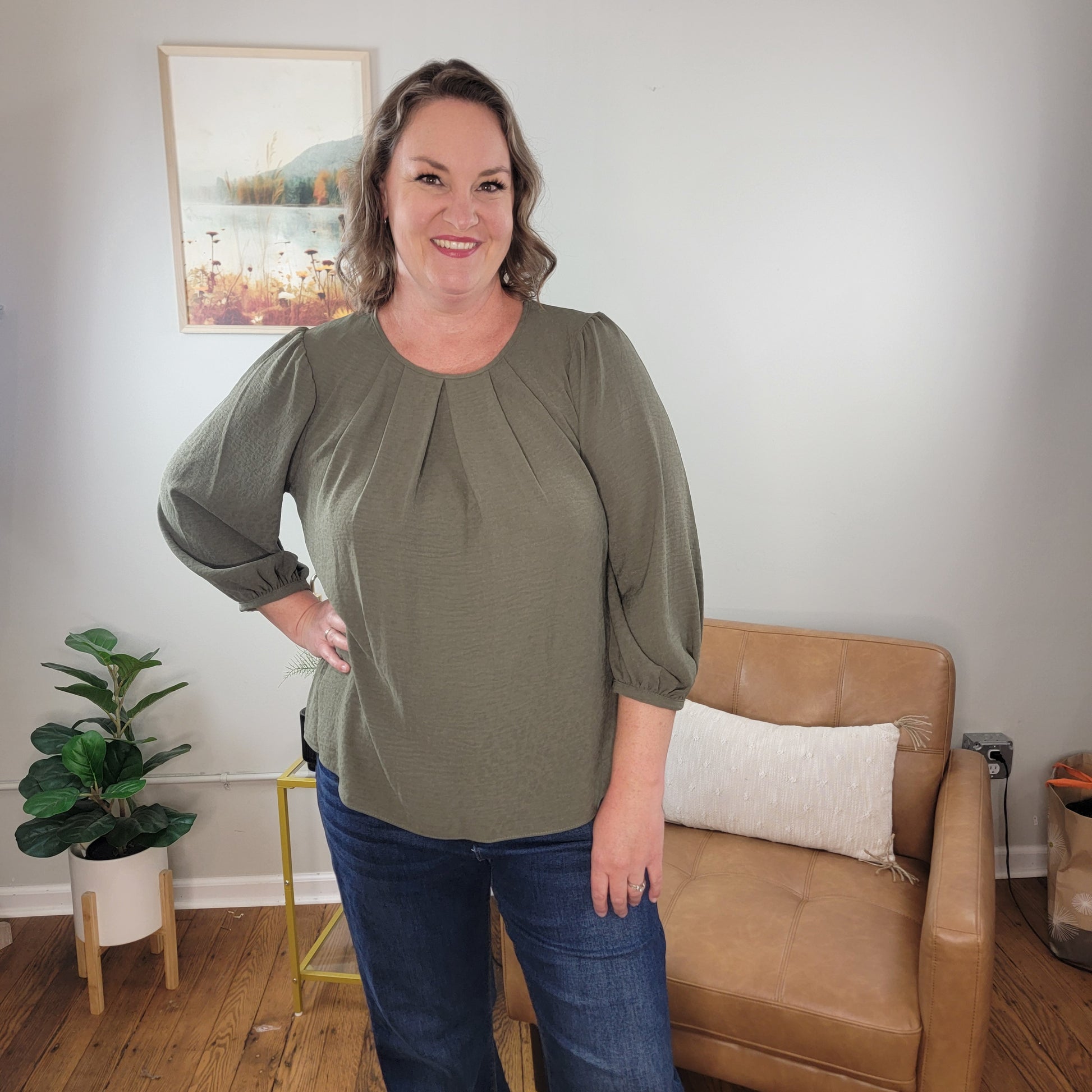Light weight and flowy, this olive top has a very subtle animal print. Pleated front for a flattering fit and keyhole back closure. Material doesn't stretch.