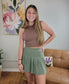 Sage green pleated skort with inside pocket, perfect for cash, keys or a cell phone. Wide elastic waistband for a comfortable fit. Light weight scuba material with stretch.