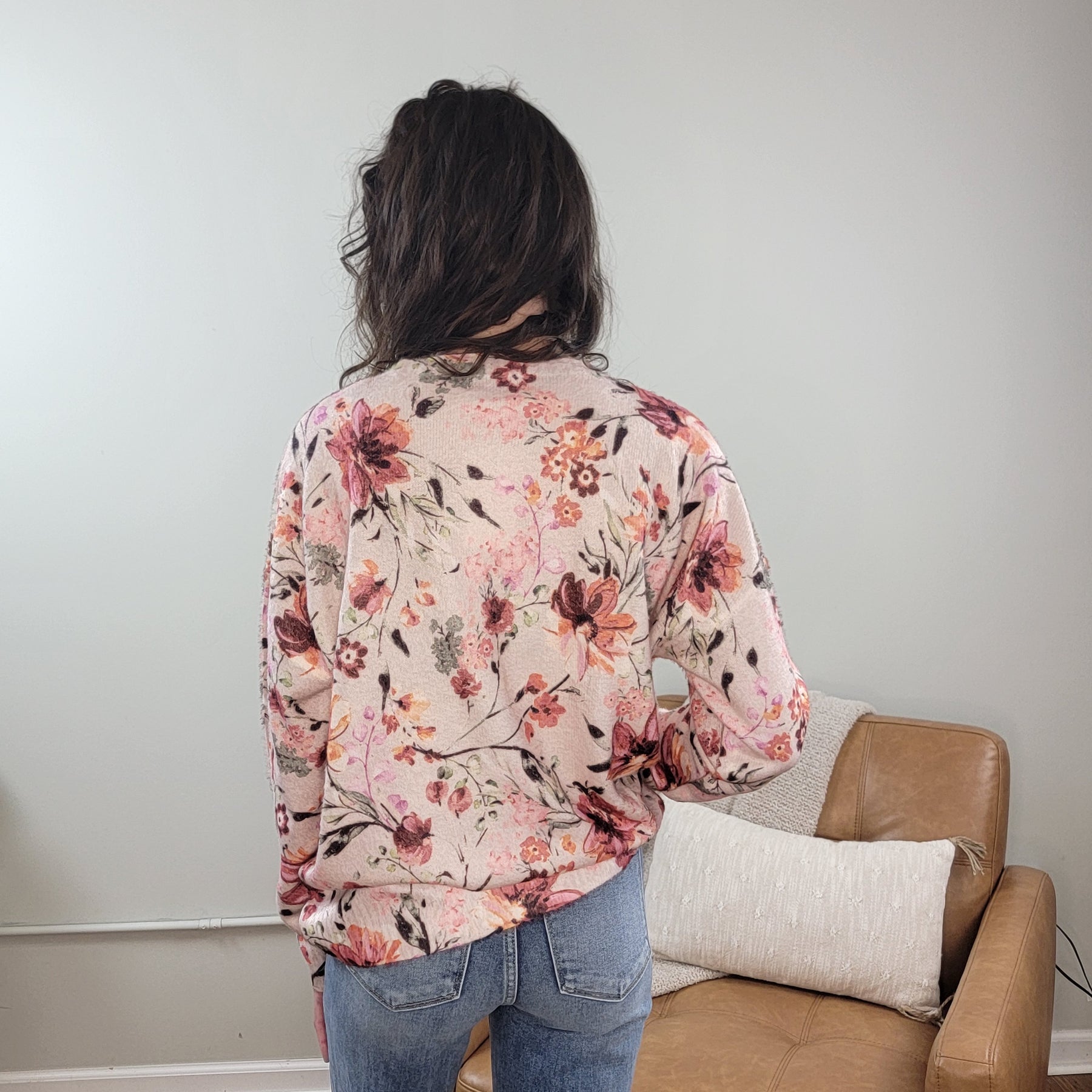 This lightweight crewneck sweater features watercolor florals in pink red and oranges. Material is a super soft and light weight knit making this a great option for your spring wardrobe.