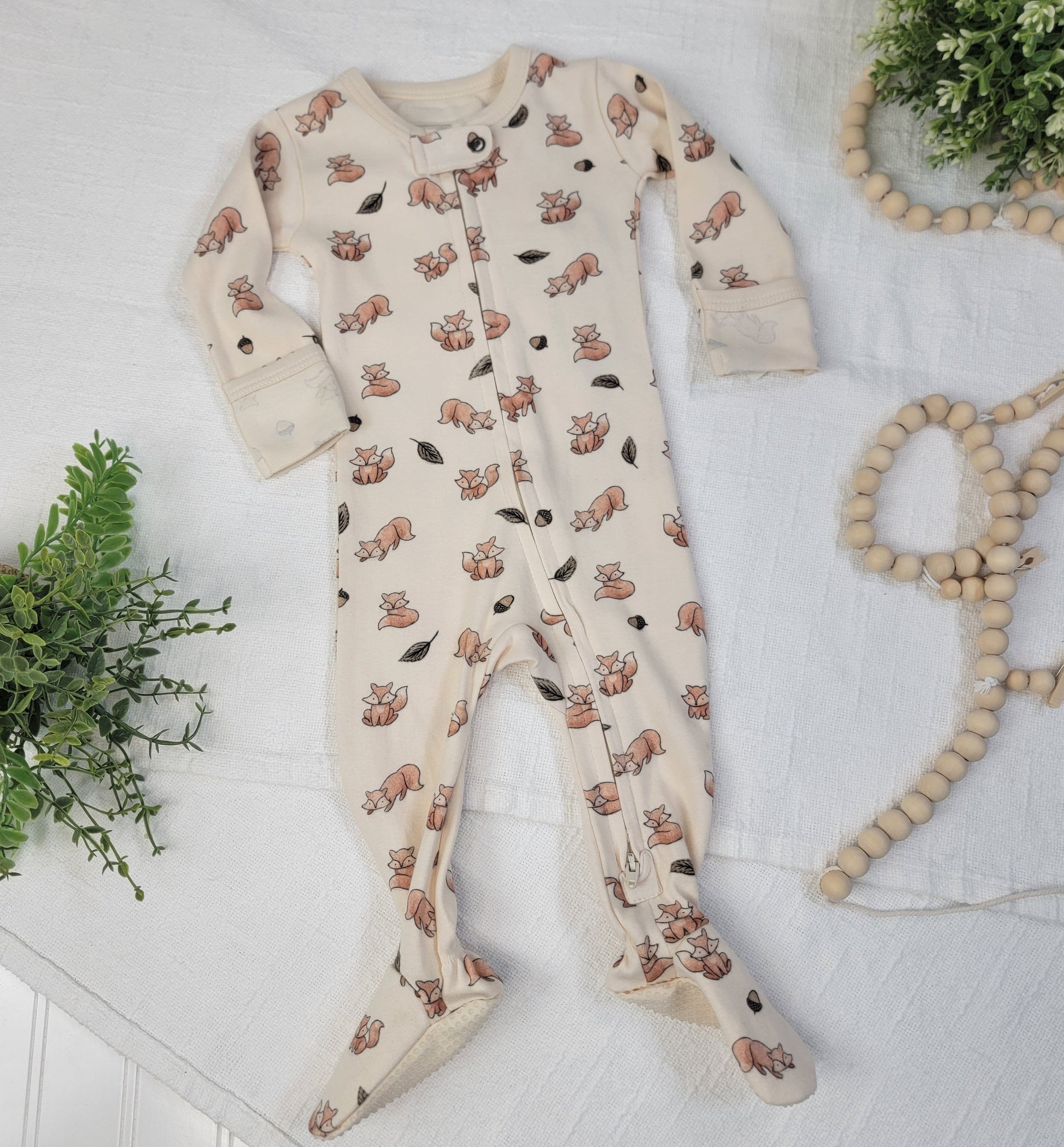 Lovedbaby Sleepwear/Romper. Organic 2-Way Zipper Footie and Organic 2-way Romper. The Footies and Romper are a Cream Color with Fox's, Leaves and Acorn.