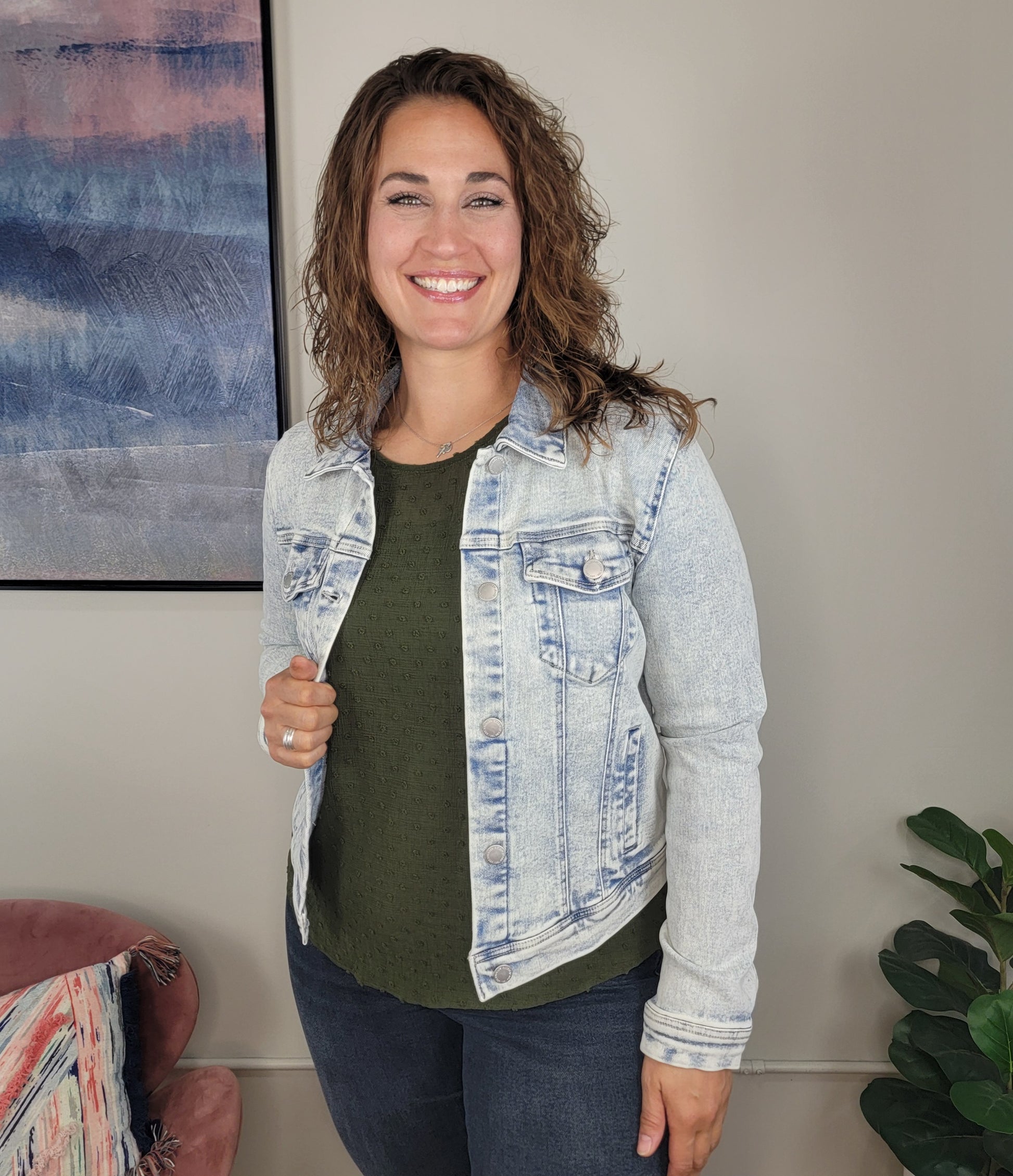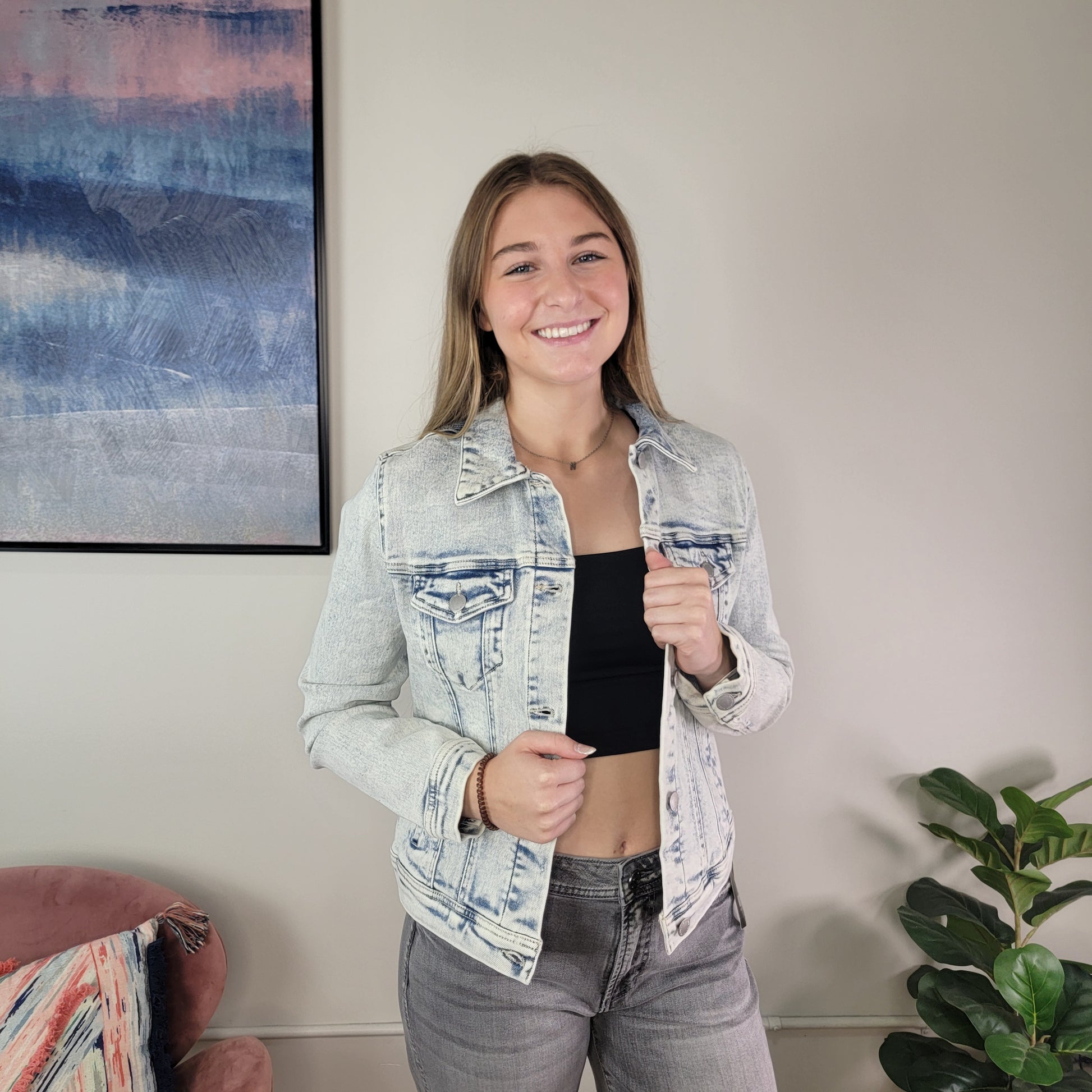 Vintage, acid light washed denim jacket from Risen. Jacket features side pockets, chest pockets and nice stretch for a comfortable fit. Jacket falls to the hips.