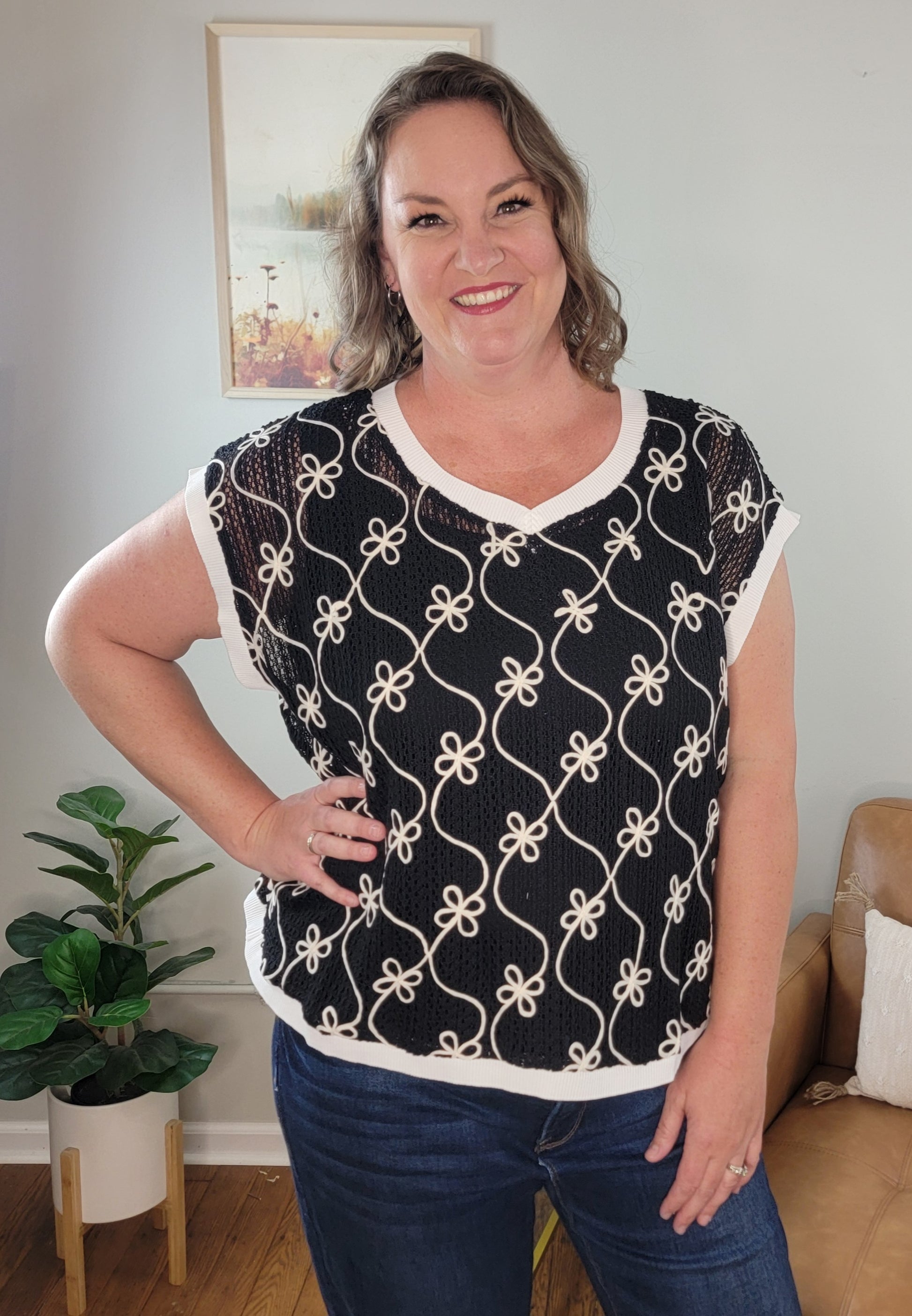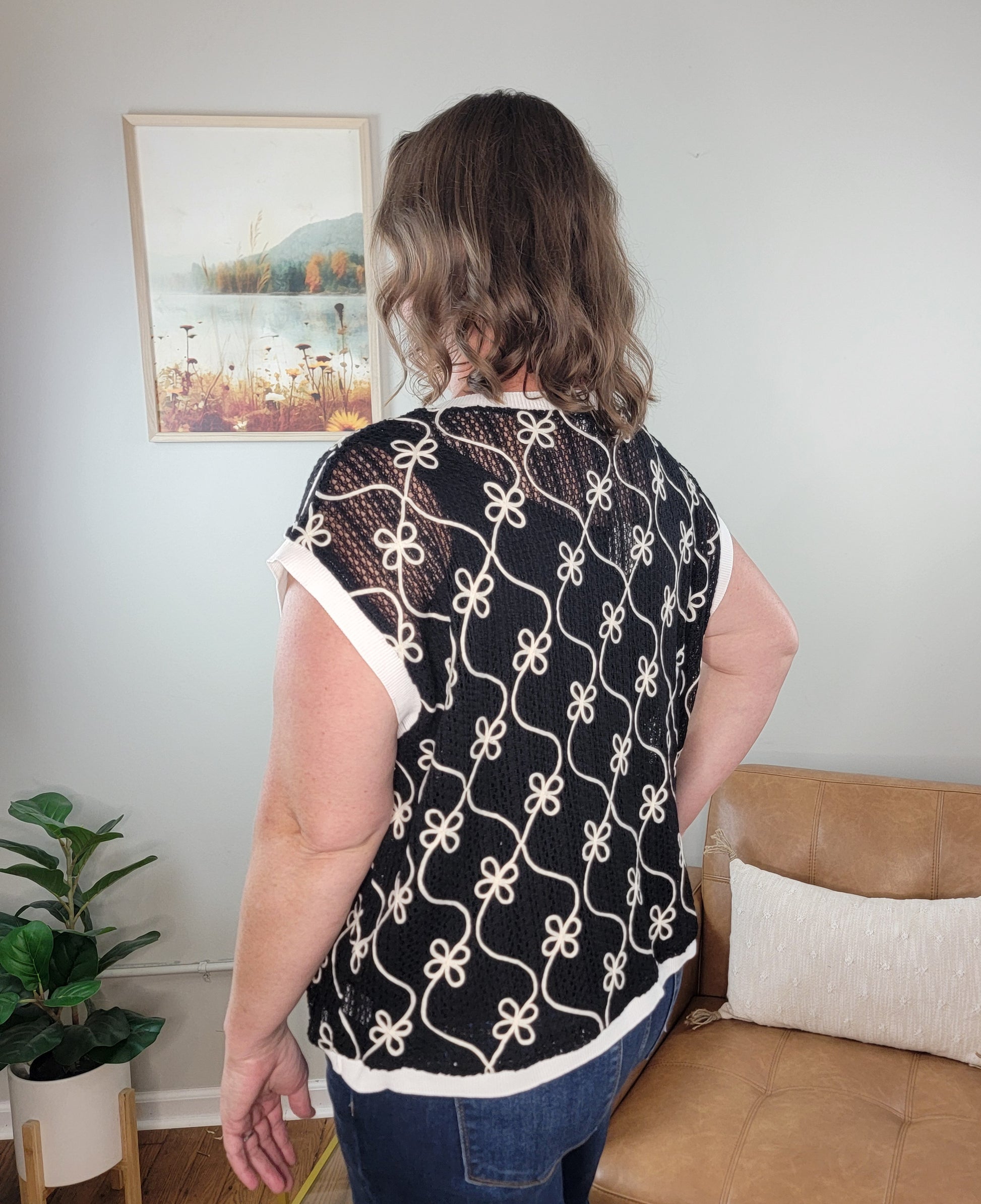 How pretty is this floral black and white vest? Light weight, semi-sheer knit material makes it a great transitional piece as it works with a layering tank underneath or with a long sleeve sheer top. Add a cardigan or jacket as the weather gets cooler. Material has some stretch.